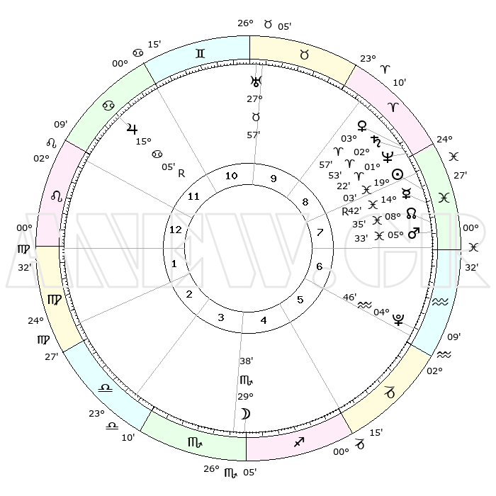 | | ΘΕΣΕΙΣ ΠΛΑΝΗΤΩΝ ΑΣΤΡΟΛΟΓΙΚΟΥ ΧΑΡΤΗ ΤΗΣ ΣΤΙΓΜΗΣ ΑΥΤΗΣ | | | | Πλανήτης | Ζώδιο | Μοίρες | Δεκαήμ. | Σε οίκο | Απόκλιση | | Ακμές των οίκων | | Ηλιος | Ιχθείς | 18°59' | Δεύτερο | 8 | 04 S 21 | | 1ος | 14°02' | Λέων | | Σελήνη | Σκορπιός | 28°57' | Τρίτο | 4 | 24 S 59 | | 2ος | 06°14' | Παρθένος | | Ερμής | Ιχθείς | 14°45'R | Δεύτερο | 8 | 02 S 49 | | 3ος | 03°09' | Ζυγός | | Αφροδίτη | Κριός | 03°53' | Πρώτο | 9 | 00 N 27 | | 4ος | 05°31' | Σκορπιός | | Αρης | Ιχθείς | 05°30' | Πρώτο | 7 | 10 S 30 | | 5ος | 10°51' | Τοξότης | | Δίας | Καρκίνος | 15°05'R | Δεύτερο | 12 | 22 N 56 | | 6ος | 14°28' | Αιγόκερως | | Κρόνος | Κριός | 02°52' | Πρώτο | 8 | 00 S 49 | | 7ος | 14°02' | Υδροχόος | | Ουρανός | Ταύρος | 27°57' | Τρίτο | 10 | 19 N 31 | | 8ος | 06°14' | Ιχθείς | | Ποσειδώνας | Κριός | 01°22' | Πρώτο | 8 | 00 S 39 | | 9ος | 03°09' | Κριός | | Πλούτωνας | Υδροχόος | 04°45' | Πρώτο | 6 | 22 S 50 | | 10ος | 05°31' | Ταύρος | | Β. Δεσμός | Ιχθείς | 08°36' | Πρώτο | 8 | 08 S 21 | | 11ος | 10°51' | Δίδυμοι | | Ωροσκόπος | Λέων | 14°02' | Δεύτερο | | | 12ος | 14°28' | Καρκίνος | | Μεσουράνημα | Ταύρος | 05°31' | Πρώτο | | | |