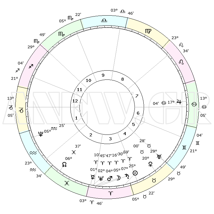 | | ΘΕΣΕΙΣ ΠΛΑΝΗΤΩΝ ΑΣΤΡΟΛΟΓΙΚΟΥ ΧΑΡΤΗ ΤΗΣ ΣΤΙΓΜΗΣ ΑΥΤΗΣ | | | | Πλανήτης | Ζώδιο | Μοίρες | Δεκαήμ. | Σε οίκο | Απόκλιση | | Ακμές των οίκων | | Ηλιος | Κριός | 25°56' | Τρίτο | 4 | 10 N 01 | | 1ος | 21°58' | Τοξότης | | Σελήνη | Κριός | 04°23' | Πρώτο | 3 | 03 N 50 | | 2ος | 27°11' | Αιγόκερως | | Ερμής | Κριός | 01°05' | Πρώτο | 3 | 01 S 58 | | 3ος | 06°23' | Ιχθείς | | Αφροδίτη | Ταύρος | 19°55' | Δεύτερο | 5 | 17 N 55 | | 4ος | 11°26' | Κριός | | Αρης | Κριός | 04°44' | Πρώτο | 3 | 00 N 59 | | 5ος | 09°04' | Ταύρος | | Δίας | Καρκίνος | 17°04' | Δεύτερο | 7 | 22 N 43 | | 6ος | 01°30' | Δίδυμοι | | Κρόνος | Κριός | 07°30' | Πρώτο | 3 | 01 N 00 | | 7ος | 21°58' | Δίδυμοι | | Ουρανός | Ταύρος | 29°28' | Τρίτο | 5 | 19 N 52 | | 8ος | 27°11' | Καρκίνος | | Ποσειδώνας | Κριός | 02°45' | Πρώτο | 3 | 00 S 07 | | 9ος | 06°23' | Παρθένος | | Πλούτωνας | Υδροχόος | 05°25' | Πρώτο | 2 | 22 S 47 | | 10ος | 11°26' | Ζυγός | | Β. Δεσμός | Ιχθείς | 06°37' | Πρώτο | 3 | 09 S 05 | | 11ος | 09°04' | Σκορπιός | | Ωροσκόπος | Τοξότης | 21°58' | Τρίτο | | | 12ος | 01°30' | Τοξότης | | Μεσουράνημα | Ζυγός | 11°26' | Δεύτερο | | | |