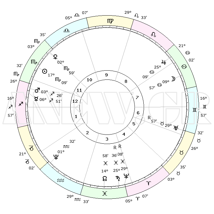| | ΘΕΣΕΙΣ ΠΛΑΝΗΤΩΝ ΑΣΤΡΟΛΟΓΙΚΟΥ ΧΑΡΤΗ ΤΗΣ ΣΤΙΓΜΗΣ ΑΥΤΗΣ | | | | Πλανήτης | Ζώδιο | Μοίρες | Δεκαήμ. | Σε οίκο | Απόκλιση | | Ακμές των οίκων | | Ηλιος | Σκορπιός | 17°05' | Δεύτερο | 12 | 16 S 56 | | 1ος | 26°41' | Σκορπιός | | Σελήνη | Καρκίνος | 08°58' | Πρώτο | 8 | 27 N 48 | | 2ος | 27°23' | Τοξότης | | Ερμής | Τοξότης | 06°50' | Πρώτο | 1 | 23 S 51 | | 3ος | 02°33' | Υδροχόος | | Αφροδίτη | Σκορπιός | 02°54' | Πρώτο | 11 | 11 S 13 | | 4ος | 08°30' | Ιχθείς | | Αρης | Τοξότης | 03°23' | Πρώτο | 1 | 21 S 17 | | 5ος | 09°55' | Κριός | | Δίας | Καρκίνος | 25°09' | Τρίτο | 8 | 21 N 12 | | 6ος | 05°25' | Ταύρος | | Κρόνος | Ιχθείς | 25°36'R | Τρίτο | 4 | 03 S 59 | | 7ος | 26°41' | Ταύρος | | Ουρανός | Ταύρος | 29°57'R | Τρίτο | 7 | 19 N 56 | | 8ος | 27°23' | Δίδυμοι | | Ποσειδώνας | Ιχθείς | 29°38'R | Τρίτο | 4 | 01 S 24 | | 9ος | 02°33' | Λέων | | Πλούτωνας | Υδροχόος | 01°32' | Πρώτο | 2 | 23 S 29 | | 10ος | 08°30' | Παρθένος | | Β. Δεσμός | Ιχθείς | 14°58' | Δεύτερο | 4 | 05 S 55 | | 11ος | 09°55' | Ζυγός | | Ωροσκόπος | Σκορπιός | 26°41' | Τρίτο | | | 12ος | 05°25' | Σκορπιός | | Μεσουράνημα | Παρθένος | 08°30' | Πρώτο | | | |