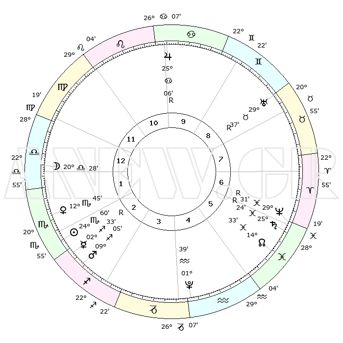 | | ΘΕΣΕΙΣ ΠΛΑΝΗΤΩΝ ΑΣΤΡΟΛΟΓΙΚΟΥ ΧΑΡΤΗ ΤΗΣ ΣΤΙΓΜΗΣ ΑΥΤΗΣ | | | | Πλανήτης | Ζώδιο | Μοίρες | Δεκαήμ. | Σε οίκο | Απόκλιση | | Ακμές των οίκων | | Ηλιος | Σκορπιός | 24°53' | Τρίτο | 3 | 18 S 59 | | 1ος | 22°52' | Παρθένος | | Σελήνη | Ζυγός | 19°15' | Δεύτερο | 2 | 10 S 05 | | 2ος | 18°54' | Ζυγός | | Ερμής | Τοξότης | 02°40'R | Πρώτο | 3 | 21 S 17 | | 3ος | 19°03' | Σκορπιός | | Αφροδίτη | Σκορπιός | 12°37' | Δεύτερο | 2 | 14 S 31 | | 4ος | 21°59' | Τοξότης | | Αρης | Τοξότης | 09°01' | Πρώτο | 3 | 22 S 20 | | 5ος | 25°05' | Αιγόκερως | | Δίας | Καρκίνος | 25°06'R | Τρίτο | 11 | 21 N 14 | | 6ος | 25°48' | Υδροχόος | | Κρόνος | Ιχθείς | 25°24'R | Τρίτο | 7 | 04 S 03 | | 7ος | 22°52' | Ιχθείς | | Ουρανός | Ταύρος | 29°38'R | Τρίτο | 9 | 19 N 52 | | 8ος | 18°54' | Κριός | | Ποσειδώνας | Ιχθείς | 29°31'R | Τρίτο | 7 | 01 S 26 | | 9ος | 19°03' | Ταύρος | | Πλούτωνας | Υδροχόος | 01°39' | Πρώτο | 5 | 23 S 28 | | 10ος | 21°59' | Δίδυμοι | | Β. Δεσμός | Ιχθείς | 14°33' | Δεύτερο | 6 | 06 S 05 | | 11ος | 25°05' | Καρκίνος | | Ωροσκόπος | Παρθένος | 22°52' | Τρίτο | | | 12ος | 25°48' | Λέων | | Μεσουράνημα | Δίδυμοι | 21°59' | Τρίτο | | | |