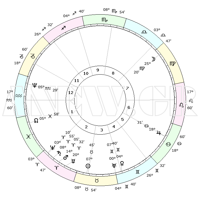 | | ΘΕΣΕΙΣ ΠΛΑΝΗΤΩΝ ΑΣΤΡΟΛΟΓΙΚΟΥ ΧΑΡΤΗ ΤΗΣ ΣΤΙΓΜΗΣ ΑΥΤΗΣ | | | | Πλανήτης | Ζώδιο | Μοίρες | Δεκαήμ. | Σε οίκο | Απόκλιση | | Ακμές των οίκων | | Ηλιος | Ταύρος | 07°41' | Πρώτο | 3 | 14 N 04 | | 1ος | 19°40' | Αιγόκερως | | Σελήνη | Παρθένος | 24°31' | Τρίτο | 8 | 00 N 48 | | 2ος | 01°43' | Ιχθείς | | Ερμής | Κριός | 20°25' | Τρίτο | 3 | 05 N 55 | | 3ος | 11°29' | Κριός | | Αφροδίτη | Δίδυμοι | 04°36' | Πρώτο | 4 | 21 N 48 | | 4ος | 11°49' | Ταύρος | | Αρης | Κριός | 14°02' | Δεύτερο | 3 | 04 N 42 | | 5ος | 05°30' | Δίδυμοι | | Δίας | Καρκίνος | 18°30' | Δεύτερο | 6 | 22 N 32 | | 6ος | 26°43' | Δίδυμοι | | Κρόνος | Κριός | 08°55' | Πρώτο | 2 | 01 N 32 | | 7ος | 19°40' | Καρκίνος | | Ουρανός | Δίδυμοι | 00°07' | Πρώτο | 4 | 20 N 00 | | 8ος | 01°43' | Παρθένος | | Ποσειδώνας | Κριός | 03°10' | Πρώτο | 2 | 00 N 03 | | 9ος | 11°29' | Ζυγός | | Πλούτωνας | Υδροχόος | 05°29' | Πρώτο | 1 | 22 S 48 | | 10ος | 11°49' | Σκορπιός | | Β. Δεσμός | Ιχθείς | 05°59' | Πρώτο | 2 | 09 S 19 | | 11ος | 05°30' | Τοξότης | | Ωροσκόπος | Αιγόκερως | 19°40' | Δεύτερο | | | 12ος | 26°43' | Τοξότης | | Μεσουράνημα | Σκορπιός | 11°49' | Δεύτερο | | | |