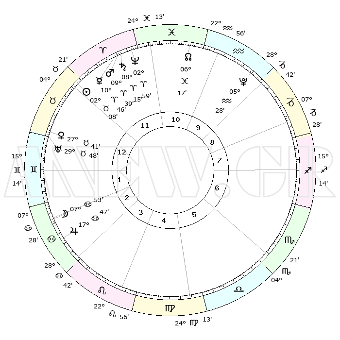 | | ΘΕΣΕΙΣ ΠΛΑΝΗΤΩΝ ΑΣΤΡΟΛΟΓΙΚΟΥ ΧΑΡΤΗ ΤΗΣ ΣΤΙΓΜΗΣ ΑΥΤΗΣ | | | | Πλανήτης | Ζώδιο | Μοίρες | Δεκαήμ. | Σε οίκο | Απόκλιση | | Ακμές των οίκων | | Ηλιος | Ταύρος | 02°04' | Πρώτο | 12 | 12 N 11 | | 1ος | 14°56' | Ταύρος | | Σελήνη | Καρκίνος | 06°51' | Πρώτο | 3 | 27 N 42 | | 2ος | 13°11' | Δίδυμοι | | Ερμής | Κριός | 10°39' | Δεύτερο | 12 | 01 N 51 | | 3ος | 05°26' | Καρκίνος | | Αφροδίτη | Ταύρος | 27°36' | Τρίτο | 1 | 20 N 06 | | 4ος | 27°24' | Καρκίνος | | Αρης | Κριός | 09°36' | Πρώτο | 12 | 02 N 56 | | 5ος | 23°32' | Λέων | | Δίας | Καρκίνος | 17°46' | Δεύτερο | 3 | 22 N 38 | | 6ος | 29°14' | Παρθένος | | Κρόνος | Κριός | 08°15' | Πρώτο | 12 | 01 N 17 | | 7ος | 14°56' | Σκορπιός | | Ουρανός | Ταύρος | 29°48' | Τρίτο | 1 | 19 N 56 | | 8ος | 13°11' | Τοξότης | | Ποσειδώνας | Κριός | 02°58' | Πρώτο | 12 | 00 S 02 | | 9ος | 05°26' | Αιγόκερως | | Πλούτωνας | Υδροχόος | 05°28' | Πρώτο | 10 | 22 S 48 | | 10ος | 27°24' | Αιγόκερως | | Β. Δεσμός | Ιχθείς | 06°17' | Πρώτο | 11 | 09 S 12 | | 11ος | 23°32' | Υδροχόος | | Ωροσκόπος | Ταύρος | 14°56' | Δεύτερο | | | 12ος | 29°14' | Ιχθείς | | Μεσουράνημα | Αιγόκερως | 27°24' | Τρίτο | | | |