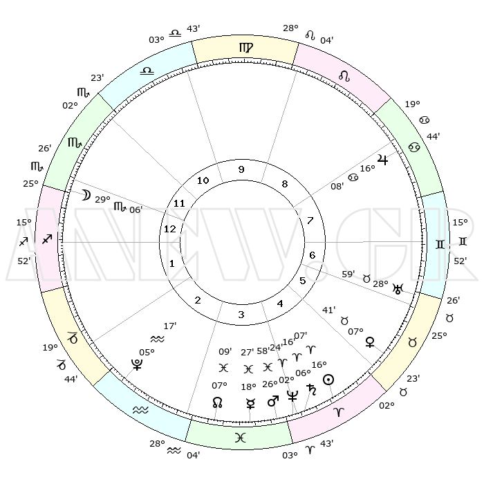 | | ΘΕΣΕΙΣ ΠΛΑΝΗΤΩΝ ΑΣΤΡΟΛΟΓΙΚΟΥ ΧΑΡΤΗ ΤΗΣ ΣΤΙΓΜΗΣ ΑΥΤΗΣ | | | | Πλανήτης | Ζώδιο | Μοίρες | Δεκαήμ. | Σε οίκο | Απόκλιση | | Ακμές των οίκων | | Ηλιος | Κριός | 16°03' | Δεύτερο | 5 | 06 N 19 | | 1ος | 26°04' | Σκορπιός | | Σελήνη | Σκορπιός | 28°18' | Τρίτο | 1 | 24 S 44 | | 2ος | 26°41' | Τοξότης | | Ερμής | Ιχθείς | 18°23' | Δεύτερο | 4 | 06 S 24 | | 3ος | 01°45' | Υδροχόος | | Αφροδίτη | Ταύρος | 07°36' | Πρώτο | 6 | 13 N 49 | | 4ος | 07°40' | Ιχθείς | | Αρης | Ιχθείς | 26°54' | Τρίτο | 4 | 02 S 10 | | 5ος | 09°10' | Κριός | | Δίας | Καρκίνος | 16°08' | Δεύτερο | 8 | 22 N 50 | | 6ος | 04°45' | Ταύρος | | Κρόνος | Κριός | 06°16' | Πρώτο | 4 | 00 N 32 | | 7ος | 26°04' | Ταύρος | | Ουρανός | Ταύρος | 28°59' | Τρίτο | 7 | 19 N 46 | | 8ος | 26°41' | Δίδυμοι | | Ποσειδώνας | Κριός | 02°23' | Πρώτο | 4 | 00 S 15 | | 9ος | 01°45' | Λέων | | Πλούτωνας | Υδροχόος | 05°17' | Πρώτο | 3 | 22 S 47 | | 10ος | 07°40' | Παρθένος | | Β. Δεσμός | Ιχθείς | 07°09' | Πρώτο | 3 | 08 S 53 | | 11ος | 09°10' | Ζυγός | | Ωροσκόπος | Σκορπιός | 26°04' | Τρίτο | | | 12ος | 04°45' | Σκορπιός | | Μεσουράνημα | Παρθένος | 07°40' | Πρώτο | | | |
