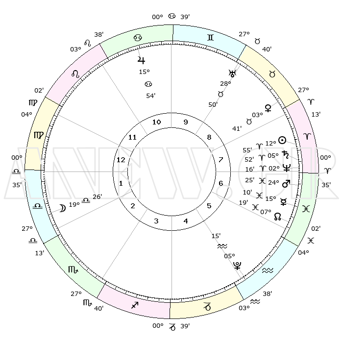 | | ΘΕΣΕΙΣ ΠΛΑΝΗΤΩΝ ΑΣΤΡΟΛΟΓΙΚΟΥ ΧΑΡΤΗ ΤΗΣ ΣΤΙΓΜΗΣ ΑΥΤΗΣ | | | | Πλανήτης | Ζώδιο | Μοίρες | Δεκαήμ. | Σε οίκο | Απόκλιση | | Ακμές των οίκων | | Ηλιος | Κριός | 12°47' | Δεύτερο | 8 | 05 N 03 | | 1ος | 22°57' | Λέων | | Σελήνη | Ζυγός | 17°50' | Δεύτερο | 3 | 10 S 01 | | 2ος | 16°03' | Παρθένος | | Ερμής | Ιχθείς | 15°03' | Δεύτερο | 7 | 07 S 18 | | 3ος | 14°02' | Ζυγός | | Αφροδίτη | Ταύρος | 03°32' | Πρώτο | 9 | 12 N 20 | | 4ος | 16°48' | Σκορπιός | | Αρης | Ιχθείς | 24°19' | Τρίτο | 8 | 03 S 13 | | 5ος | 21°30' | Τοξότης | | Δίας | Καρκίνος | 15°53' | Δεύτερο | 11 | 22 N 51 | | 6ος | 24°05' | Αιγόκερως | | Κρόνος | Κριός | 05°51' | Πρώτο | 8 | 00 N 22 | | 7ος | 22°57' | Υδροχόος | | Ουρανός | Ταύρος | 28°50' | Τρίτο | 10 | 19 N 44 | | 8ος | 16°03' | Ιχθείς | | Ποσειδώνας | Κριός | 02°16' | Πρώτο | 8 | 00 S 18 | | 9ος | 14°02' | Κριός | | Πλούτωνας | Υδροχόος | 05°14' | Πρώτο | 6 | 22 S 47 | | 10ος | 16°48' | Ταύρος | | Β. Δεσμός | Ιχθείς | 07°19' | Πρώτο | 7 | 08 S 49 | | 11ος | 21°30' | Δίδυμοι | | Ωροσκόπος | Λέων | 22°57' | Τρίτο | | | 12ος | 24°05' | Καρκίνος | | Μεσουράνημα | Ταύρος | 16°48' | Δεύτερο | | | |