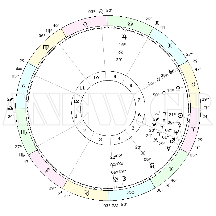 | | ΘΕΣΕΙΣ ΠΛΑΝΗΤΩΝ ΑΣΤΡΟΛΟΓΙΚΟΥ ΧΑΡΤΗ ΤΗΣ ΣΤΙΓΜΗΣ ΑΥΤΗΣ | | | | Πλανήτης | Ζώδιο | Μοίρες | Δεκαήμ. | Σε οίκο | Απόκλιση | | Ακμές των οίκων | | Ηλιος | Κριός | 21°47' | Τρίτο | 7 | 08 N 29 | | 1ος | 12°32' | Ζυγός | | Σελήνη | Υδροχόος | 08°19' | Πρώτο | 4 | 20 S 40 | | 2ος | 09°56' | Σκορπιός | | Ερμής | Ιχθείς | 25°19' | Τρίτο | 6 | 04 S 06 | | 3ος | 10°52' | Τοξότης | | Αφροδίτη | Ταύρος | 14°45' | Δεύτερο | 8 | 16 N 17 | | 4ος | 14°08' | Αιγόκερως | | Αρης | Κριός | 01°27' | Πρώτο | 6 | 00 S 20 | | 5ος | 17°04' | Υδροχόος | | Δίας | Καρκίνος | 16°38' | Δεύτερο | 10 | 22 N 46 | | 6ος | 16°57' | Ιχθείς | | Κρόνος | Κριός | 06°59' | Πρώτο | 6 | 00 N 48 | | 7ος | 12°32' | Κριός | | Ουρανός | Ταύρος | 29°15' | Τρίτο | 8 | 19 N 49 | | 8ος | 09°56' | Ταύρος | | Ποσειδώνας | Κριός | 02°36' | Πρώτο | 6 | 00 S 10 | | 9ος | 10°52' | Δίδυμοι | | Πλούτωνας | Υδροχόος | 05°22' | Πρώτο | 4 | 22 S 47 | | 10ος | 14°08' | Καρκίνος | | Β. Δεσμός | Ιχθείς | 06°50' | Πρώτο | 5 | 09 S 00 | | 11ος | 17°04' | Λέων | | Ωροσκόπος | Ζυγός | 12°32' | Δεύτερο | | | 12ος | 16°57' | Παρθένος | | Μεσουράνημα | Καρκίνος | 14°08' | Δεύτερο | | | |