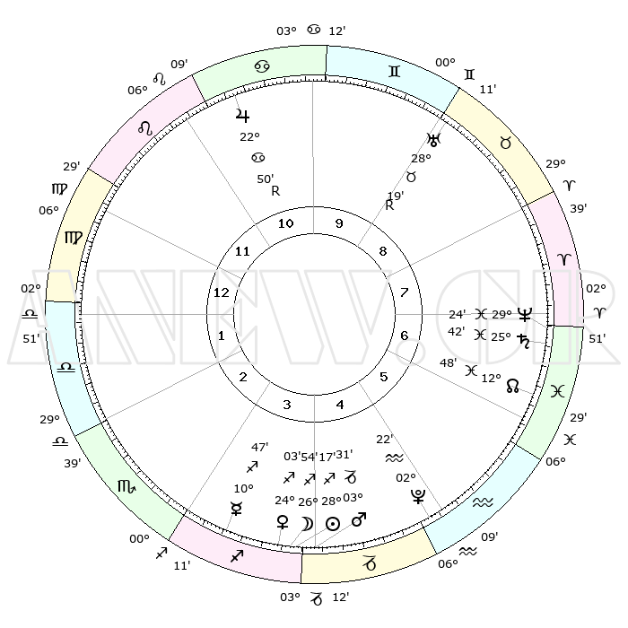 | | ΘΕΣΕΙΣ ΠΛΑΝΗΤΩΝ ΑΣΤΡΟΛΟΓΙΚΟΥ ΧΑΡΤΗ ΤΗΣ ΣΤΙΓΜΗΣ ΑΥΤΗΣ | | | | Πλανήτης | Ζώδιο | Μοίρες | Δεκαήμ. | Σε οίκο | Απόκλιση | | Ακμές των οίκων | | Ηλιος | Τοξότης | 28°13' | Τρίτο | 4 | 23 S 25 | | 1ος | 11°23' | Παρθένος | | Σελήνη | Τοξότης | 26°02' | Τρίτο | 4 | 28 S 14 | | 2ος | 06°23' | Ζυγός | | Ερμής | Τοξότης | 10°41' | Δεύτερο | 4 | 21 S 08 | | 3ος | 05°56' | Σκορπιός | | Αφροδίτη | Τοξότης | 23°57' | Τρίτο | 4 | 23 S 20 | | 4ος | 08°53' | Τοξότης | | Αρης | Αιγόκερως | 03°27' | Πρώτο | 4 | 24 S 12 | | 5ος | 12°24' | Αιγόκερως | | Δίας | Καρκίνος | 22°50'R | Τρίτο | 11 | 21 N 42 | | 6ος | 13°37' | Υδροχόος | | Κρόνος | Ιχθείς | 25°42' | Τρίτο | 7 | 03 S 49 | | 7ος | 11°23' | Ιχθείς | | Ουρανός | Ταύρος | 28°19'R | Τρίτο | 9 | 19 N 35 | | 8ος | 06°23' | Κριός | | Ποσειδώνας | Ιχθείς | 29°24' | Τρίτο | 7 | 01 S 28 | | 9ος | 05°56' | Ταύρος | | Πλούτωνας | Υδροχόος | 02°22' | Πρώτο | 5 | 23 S 18 | | 10ος | 08°53' | Δίδυμοι | | Β. Δεσμός | Ιχθείς | 12°49' | Δεύτερο | 7 | 06 S 45 | | 11ος | 12°24' | Καρκίνος | | Ωροσκόπος | Παρθένος | 11°23' | Δεύτερο | | | 12ος | 13°37' | Λέων | | Μεσουράνημα | Δίδυμοι | 08°53' | Πρώτο | | | |