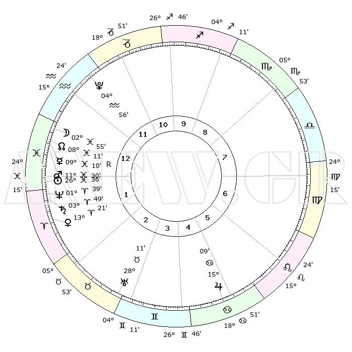 | | ΘΕΣΕΙΣ ΠΛΑΝΗΤΩΝ ΑΣΤΡΟΛΟΓΙΚΟΥ ΧΑΡΤΗ ΤΗΣ ΣΤΙΓΜΗΣ ΑΥΤΗΣ | | | | Πλανήτης | Ζώδιο | Μοίρες | Δεκαήμ. | Σε οίκο | Απόκλιση | | Ακμές των οίκων | | Ηλιος | Ιχθείς | 26°28' | Τρίτο | 2 | 01 S 24 | | 1ος | 21°31' | Αιγόκερως | | Σελήνη | Ιχθείς | 01°15' | Πρώτο | 1 | 11 S 42 | | 2ος | 03°60' | Ιχθείς | | Ερμής | Ιχθείς | 09°13'R | Πρώτο | 2 | 06 S 20 | | 3ος | 13°34' | Κριός | | Αφροδίτη | Κριός | 13°12' | Δεύτερο | 2 | 04 N 18 | | 4ος | 13°34' | Ταύρος | | Αρης | Ιχθείς | 11°24' | Δεύτερο | 2 | 08 S 17 | | 5ος | 07°03' | Δίδυμοι | | Δίας | Καρκίνος | 15°09' | Δεύτερο | 6 | 22 N 56 | | 6ος | 28°17' | Δίδυμοι | | Κρόνος | Κριός | 03°48' | Πρώτο | 2 | 00 S 26 | | 7ος | 21°31' | Καρκίνος | | Ουρανός | Ταύρος | 28°11' | Τρίτο | 4 | 19 N 35 | | 8ος | 03°60' | Παρθένος | | Ποσειδώνας | Κριός | 01°39' | Πρώτο | 2 | 00 S 33 | | 9ος | 13°34' | Ζυγός | | Πλούτωνας | Υδροχόος | 04°56' | Πρώτο | 1 | 22 S 49 | | 10ος | 13°34' | Σκορπιός | | Β. Δεσμός | Ιχθείς | 08°12' | Πρώτο | 2 | 08 S 30 | | 11ος | 07°03' | Τοξότης | | Ωροσκόπος | Αιγόκερως | 21°31' | Τρίτο | | | 12ος | 28°17' | Τοξότης | | Μεσουράνημα | Σκορπιός | 13°34' | Δεύτερο | | | |