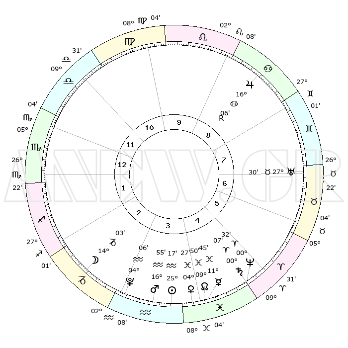 | | ΘΕΣΕΙΣ ΠΛΑΝΗΤΩΝ ΑΣΤΡΟΛΟΓΙΚΟΥ ΧΑΡΤΗ ΤΗΣ ΣΤΙΓΜΗΣ ΑΥΤΗΣ | | | | Πλανήτης | Ζώδιο | Μοίρες | Δεκαήμ. | Σε οίκο | Απόκλιση | | Ακμές των οίκων | | Ηλιος | Υδροχόος | 25°12' | Τρίτο | 4 | 13 S 07 | | 1ος | 04°38' | Σκορπιός | | Σελήνη | Αιγόκερως | 13°08' | Δεύτερο | 3 | 27 S 07 | | 2ος | 03°20' | Τοξότης | | Ερμής | Ιχθείς | 11°38' | Δεύτερο | 4 | 07 S 22 | | 3ος | 05°41' | Αιγόκερως | | Αφροδίτη | Ιχθείς | 04°22' | Πρώτο | 4 | 11 S 16 | | 4ος | 10°12' | Υδροχόος | | Αρης | Υδροχόος | 16°52' | Δεύτερο | 4 | 16 S 48 | | 5ος | 13°02' | Ιχθείς | | Δίας | Καρκίνος | 16°07'R | Δεύτερο | 9 | 22 N 47 | | 6ος | 11°16' | Κριός | | Κρόνος | Κριός | 00°06' | Πρώτο | 5 | 01 S 56 | | 7ος | 04°38' | Ταύρος | | Ουρανός | Ταύρος | 27°30' | Τρίτο | 7 | 19 N 25 | | 8ος | 03°20' | Δίδυμοι | | Ποσειδώνας | Κριός | 00°32' | Πρώτο | 5 | 00 S 59 | | 9ος | 05°41' | Καρκίνος | | Πλούτωνας | Υδροχόος | 04°06' | Πρώτο | 3 | 22 S 57 | | 10ος | 10°12' | Λέων | | Β. Δεσμός | Ιχθείς | 09°51' | Πρώτο | 4 | 07 S 53 | | 11ος | 13°02' | Παρθένος | | Ωροσκόπος | Σκορπιός | 04°38' | Πρώτο | | | 12ος | 11°16' | Ζυγός | | Μεσουράνημα | Λέων | 10°12' | Δεύτερο | | | |