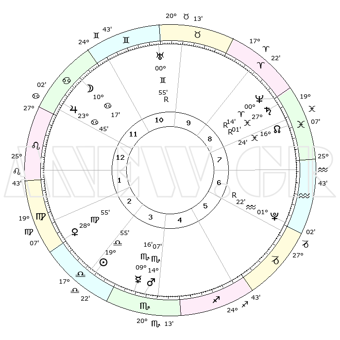 | ΘΕΣΕΙΣ ΠΛΑΝΗΤΩΝ ΑΣΤΡΟΛΟΓΙΚΟΥ ΧΑΡΤΗ ΤΗΣ ΣΤΙΓΜΗΣ ΑΥΤΗΣ | | Πλανήτης | Ζώδιο | Μοίρες | Δεκαήμ. | Σε οίκο | Απόκλιση | | Ακμές των οίκων | Ηλιος | Ζυγός | 19°49' | Δεύτερο | 4 | 07 S 45 | | 1ος | 28°18' | Καρκίνος | Σελήνη | Καρκίνος | 08°58' | Πρώτο | 12 | 27 N 59 | | 2ος | 19°14' | Λέων | Ερμής | Σκορπιός | 09°08' | Πρώτο | 4 | 15 S 58 | | 3ος | 14°03' | Παρθένος | Αφροδίτη | Παρθένος | 28°48' | Τρίτο | 3 | 01 N 51 | | 4ος | 14°52' | Ζυγός | Αρης | Σκορπιός | 14°03' | Δεύτερο | 4 | 16 S 15 | | 5ος | 20°56' | Σκορπιός | Δίας | Καρκίνος | 23°45' | Τρίτο | 12 | 21 N 23 | | 6ος | 26°56' | Τοξότης | Κρόνος | Ιχθείς | 27°02'R | Τρίτο | 9 | 03 S 29 | | 7ος | 28°18' | Αιγόκερως | Ουρανός | Δίδυμοι | 00°55'R | Πρώτο | 11 | 20 N 08 | | 8ος | 19°14' | Υδροχόος | Ποσειδώνας | Κριός | 00°14'R | Πρώτο | 9 | 01 S 10 | | 9ος | 14°03' | Ιχθείς | Πλούτωνας | Υδροχόος | 01°22'R | Πρώτο | 7 | 23 S 32 | | 10ος | 14°52' | Κριός | Β. Δεσμός | Ιχθείς | 16°25' | Δεύτερο | 9 | 05 S 22 | | 11ος | 20°56' | Ταύρος | Ωροσκόπος | Καρκίνος | 28°18' | Τρίτο | | | 12ος | 26°56' | Δίδυμοι | Μεσουράνημα | Κριός | 14°52' | Δεύτερο | | | |