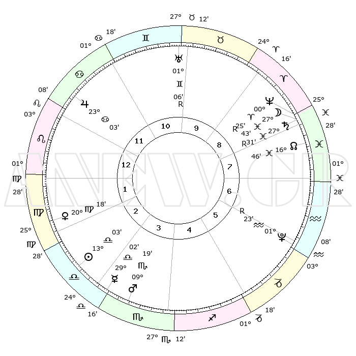 | ΘΕΣΕΙΣ ΠΛΑΝΗΤΩΝ ΑΣΤΡΟΛΟΓΙΚΟΥ ΧΑΡΤΗ ΤΗΣ ΣΤΙΓΜΗΣ ΑΥΤΗΣ | | Πλανήτης | Ζώδιο | Μοίρες | Δεκαήμ. | Σε οίκο | Απόκλιση | | Ακμές των οίκων | Ηλιος | Ζυγός | 12°58' | Δεύτερο | 3 | 05 S 07 | | 1ος | 07°30' | Λέων | Σελήνη | Ιχθείς | 26°31' | Τρίτο | 9 | 00 S 41 | | 2ος | 29°07' | Λέων | Ερμής | Ζυγός | 28°54' | Τρίτο | 4 | 11 S 44 | | 3ος | 25°11' | Παρθένος | Αφροδίτη | Παρθένος | 20°12' | Τρίτο | 2 | 05 N 10 | | 4ος | 27°02' | Ζυγός | Αρης | Σκορπιός | 09°16' | Πρώτο | 4 | 14 S 42 | | 5ος | 02°47' | Τοξότης | Δίας | Καρκίνος | 23°03' | Τρίτο | 12 | 21 N 30 | | 6ος | 07°18' | Αιγόκερως | Κρόνος | Ιχθείς | 27°31'R | Τρίτο | 9 | 03 S 17 | | 7ος | 07°30' | Υδροχόος | Ουρανός | Δίδυμοι | 01°06'R | Πρώτο | 10 | 20 N 10 | | 8ος | 29°07' | Υδροχόος | Ποσειδώνας | Κριός | 00°25'R | Πρώτο | 9 | 01 S 06 | | 9ος | 25°11' | Ιχθείς | Πλούτωνας | Υδροχόος | 01°23'R | Πρώτο | 6 | 23 S 32 | | 10ος | 27°02' | Κριός | Β. Δεσμός | Ιχθείς | 16°47' | Δεύτερο | 8 | 05 S 13 | | 11ος | 02°47' | Δίδυμοι | Ωροσκόπος | Λέων | 07°30' | Πρώτο | | | 12ος | 07°18' | Καρκίνος | Μεσουράνημα | Κριός | 27°02' | Τρίτο | | | |