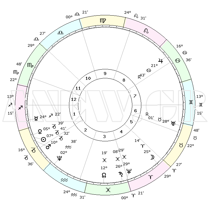 | | ΘΕΣΕΙΣ ΠΛΑΝΗΤΩΝ ΑΣΤΡΟΛΟΓΙΚΟΥ ΧΑΡΤΗ ΤΗΣ ΣΤΙΓΜΗΣ ΑΥΤΗΣ | | | | Πλανήτης | Ζώδιο | Μοίρες | Δεκαήμ. | Σε οίκο | Απόκλιση | | Ακμές των οίκων | | Ηλιος | Αιγόκερως | 07°32' | Πρώτο | 3 | 23 S 13 | | 1ος | 02°15' | Σκορπιός | | Σελήνη | Κριός | 23°15' | Τρίτο | 6 | 12 N 11 | | 2ος | 00°48' | Τοξότης | | Ερμής | Τοξότης | 24°09' | Τρίτο | 2 | 23 S 32 | | 3ος | 02°56' | Αιγόκερως | | Αφροδίτη | Αιγόκερως | 05°28' | Πρώτο | 3 | 23 S 43 | | 4ος | 07°17' | Υδροχόος | | Αρης | Αιγόκερως | 10°25' | Δεύτερο | 3 | 23 S 54 | | 5ος | 10°10' | Ιχθείς | | Δίας | Καρκίνος | 21°44'R | Τρίτο | 9 | 21 N 54 | | 6ος | 08°38' | Κριός | | Κρόνος | Ιχθείς | 26°07' | Τρίτο | 5 | 03 S 38 | | 7ος | 02°15' | Ταύρος | | Ουρανός | Ταύρος | 28°02'R | Τρίτο | 7 | 19 N 31 | | 8ος | 00°48' | Δίδυμοι | | Ποσειδώνας | Ιχθείς | 29°28' | Τρίτο | 5 | 01 S 26 | | 9ος | 02°56' | Καρκίνος | | Πλούτωνας | Υδροχόος | 02°38' | Πρώτο | 3 | 23 S 14 | | 10ος | 07°17' | Λέων | | Β. Δεσμός | Ιχθείς | 12°20' | Δεύτερο | 5 | 06 S 56 | | 11ος | 10°10' | Παρθένος | | Ωροσκόπος | Σκορπιός | 02°15' | Πρώτο | | | 12ος | 08°38' | Ζυγός | | Μεσουράνημα | Λέων | 07°17' | Πρώτο | | | |