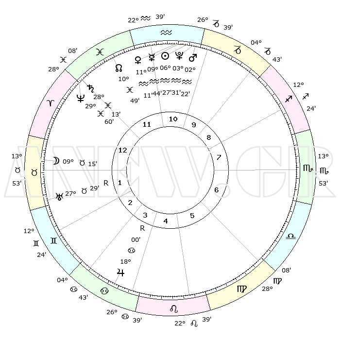 | | ΘΕΣΕΙΣ ΠΛΑΝΗΤΩΝ ΑΣΤΡΟΛΟΓΙΚΟΥ ΧΑΡΤΗ ΤΗΣ ΣΤΙΓΜΗΣ ΑΥΤΗΣ | | | | Πλανήτης | Ζώδιο | Μοίρες | Δεκαήμ. | Σε οίκο | Απόκλιση | | Ακμές των οίκων | | Ηλιος | Υδροχόος | 06°23' | Πρώτο | 11 | 18 S 40 | | 1ος | 09°09' | Κριός | | Σελήνη | Ταύρος | 08°21' | Πρώτο | 1 | 18 N 30 | | 2ος | 17°07' | Ταύρος | | Ερμής | Υδροχόος | 09°37' | Πρώτο | 11 | 19 S 51 | | 3ος | 13°11' | Δίδυμοι | | Αφροδίτη | Υδροχόος | 11°06' | Δεύτερο | 11 | 18 S 39 | | 4ος | 05°09' | Καρκίνος | | Αρης | Υδροχόος | 02°19' | Πρώτο | 11 | 20 S 38 | | 5ος | 27°55' | Καρκίνος | | Δίας | Καρκίνος | 18°01'R | Δεύτερο | 4 | 22 N 31 | | 6ος | 26°48' | Λέων | | Κρόνος | Ιχθείς | 28°13' | Τρίτο | 12 | 02 S 43 | | 7ος | 09°09' | Ζυγός | | Ουρανός | Ταύρος | 27°29'R | Τρίτο | 2 | 19 N 25 | | 8ος | 17°07' | Σκορπιός | | Ποσειδώνας | Ιχθείς | 29°60' | Τρίτο | 12 | 01 S 13 | | 9ος | 13°11' | Τοξότης | | Πλούτωνας | Υδροχόος | 03°31' | Πρώτο | 11 | 23 S 03 | | 10ος | 05°09' | Αιγόκερως | | Β. Δεσμός | Ιχθείς | 10°50' | Δεύτερο | 12 | 07 S 30 | | 11ος | 27°55' | Αιγόκερως | | Ωροσκόπος | Κριός | 09°09' | Πρώτο | | | 12ος | 26°48' | Υδροχόος | | Μεσουράνημα | Αιγόκερως | 05°09' | Πρώτο | | | |