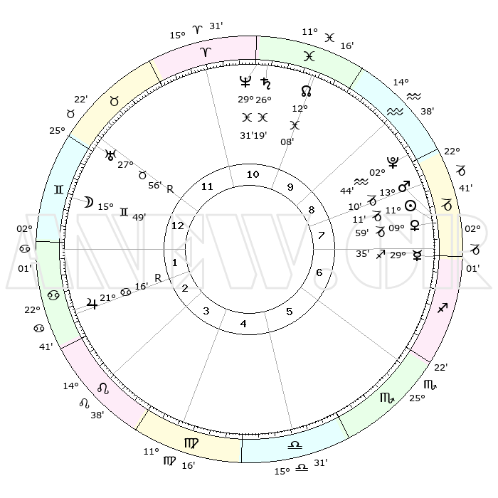 | | ΘΕΣΕΙΣ ΠΛΑΝΗΤΩΝ ΑΣΤΡΟΛΟΓΙΚΟΥ ΧΑΡΤΗ ΤΗΣ ΣΤΙΓΜΗΣ ΑΥΤΗΣ | | | | Πλανήτης | Ζώδιο | Μοίρες | Δεκαήμ. | Σε οίκο | Απόκλιση | | Ακμές των οίκων | | Ηλιος | Αιγόκερως | 11°07' | Δεύτερο | 8 | 22 S 58 | | 1ος | 04°35' | Δίδυμοι | | Σελήνη | Δίδυμοι | 14°41' | Δεύτερο | 1 | 27 N 34 | | 2ος | 28°31' | Δίδυμοι | | Ερμής | Τοξότης | 29°28' | Τρίτο | 8 | 24 S 04 | | 3ος | 19°48' | Καρκίνος | | Αφροδίτη | Αιγόκερως | 09°53' | Πρώτο | 8 | 23 S 35 | | 4ος | 12°56' | Λέων | | Αρης | Αιγόκερως | 13°06' | Δεύτερο | 8 | 23 S 41 | | 5ος | 12°12' | Παρθένος | | Δίας | Καρκίνος | 21°17'R | Τρίτο | 3 | 21 N 59 | | 6ος | 21°19' | Ζυγός | | Κρόνος | Ιχθείς | 26°19' | Τρίτο | 11 | 03 S 32 | | 7ος | 04°35' | Τοξότης | | Ουρανός | Ταύρος | 27°56'R | Τρίτο | 12 | 19 N 30 | | 8ος | 28°31' | Τοξότης | | Ποσειδώνας | Ιχθείς | 29°31' | Τρίτο | 11 | 01 S 25 | | 9ος | 19°48' | Αιγόκερως | | Πλούτωνας | Υδροχόος | 02°44' | Πρώτο | 9 | 23 S 13 | | 10ος | 12°56' | Υδροχόος | | Β. Δεσμός | Ιχθείς | 12°08' | Δεύτερο | 10 | 07 S 00 | | 11ος | 12°12' | Ιχθείς | | Ωροσκόπος | Δίδυμοι | 04°35' | Πρώτο | | | 12ος | 21°19' | Κριός | | Μεσουράνημα | Υδροχόος | 12°56' | Δεύτερο | | | |