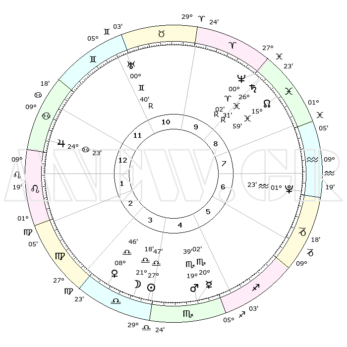 | ΘΕΣΕΙΣ ΠΛΑΝΗΤΩΝ ΑΣΤΡΟΛΟΓΙΚΟΥ ΧΑΡΤΗ ΤΗΣ ΣΤΙΓΜΗΣ ΑΥΤΗΣ | | Πλανήτης | Ζώδιο | Μοίρες | Δεκαήμ. | Σε οίκο | Απόκλιση | | Ακμές των οίκων | Ηλιος | Ζυγός | 27°40' | Τρίτο | 5 | 10 S 38 | | 1ος | 04°15' | Καρκίνος | Σελήνη | Ζυγός | 19°54' | Δεύτερο | 5 | 10 S 19 | | 2ος | 24°50' | Καρκίνος | Ερμής | Σκορπιός | 19°53' | Δεύτερο | 5 | 19 S 55 | | 3ος | 16°57' | Λέων | Αφροδίτη | Ζυγός | 08°37' | Πρώτο | 4 | 02 S 00 | | 4ος | 13°57' | Παρθένος | Αρης | Σκορπιός | 19°34' | Δεύτερο | 5 | 17 S 54 | | 5ος | 18°32' | Ζυγός | Δίας | Καρκίνος | 24°23' | Τρίτο | 1 | 21 N 18 | | 6ος | 28°10' | Σκορπιός | Κρόνος | Ιχθείς | 26°31'R | Τρίτο | 10 | 03 S 40 | | 7ος | 04°15' | Αιγόκερως | Ουρανός | Δίδυμοι | 00°40'R | Πρώτο | 12 | 20 N 05 | | 8ος | 24°50' | Αιγόκερως | Ποσειδώνας | Κριός | 00°02'R | Πρώτο | 10 | 01 S 15 | | 9ος | 16°57' | Υδροχόος | Πλούτωνας | Υδροχόος | 01°23' | Πρώτο | 8 | 23 S 32 | | 10ος | 13°57' | Ιχθείς | Β. Δεσμός | Ιχθείς | 15°60' | Δεύτερο | 10 | 05 S 31 | | 11ος | 18°32' | Κριός | Ωροσκόπος | Καρκίνος | 04°15' | Πρώτο | | | 12ος | 28°10' | Ταύρος | Μεσουράνημα | Ιχθείς | 13°57' | Δεύτερο | | | |