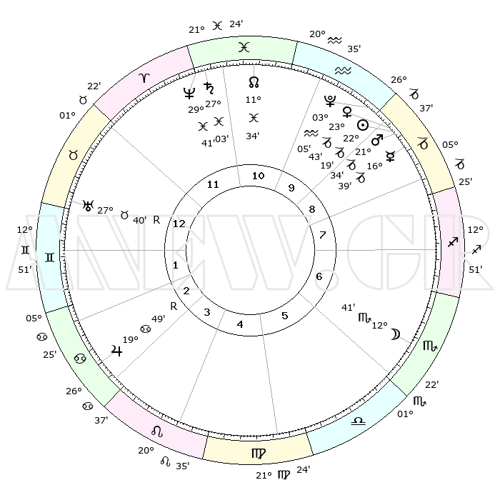 | | ΘΕΣΕΙΣ ΠΛΑΝΗΤΩΝ ΑΣΤΡΟΛΟΓΙΚΟΥ ΧΑΡΤΗ ΤΗΣ ΣΤΙΓΜΗΣ ΑΥΤΗΣ | | | | Πλανήτης | Ζώδιο | Μοίρες | Δεκαήμ. | Σε οίκο | Απόκλιση | | Ακμές των οίκων | | Ηλιος | Αιγόκερως | 22°11' | Τρίτο | 10 | 21 S 36 | | 1ος | 09°32' | Κριός | | Σελήνη | Σκορπιός | 11°08' | Δεύτερο | 7 | 19 S 25 | | 2ος | 17°24' | Ταύρος | | Ερμής | Αιγόκερως | 16°26' | Δεύτερο | 10 | 24 S 02 | | 3ος | 13°25' | Δίδυμοι | | Αφροδίτη | Αιγόκερως | 23°33' | Τρίτο | 10 | 22 S 16 | | 4ος | 05°22' | Καρκίνος | | Αρης | Αιγόκερως | 21°28' | Τρίτο | 10 | 22 S 40 | | 5ος | 28°10' | Καρκίνος | | Δίας | Καρκίνος | 19°50'R | Δεύτερο | 4 | 22 N 14 | | 6ος | 27°06' | Λέων | | Κρόνος | Ιχθείς | 27°03' | Τρίτο | 12 | 03 S 13 | | 7ος | 09°32' | Ζυγός | | Ουρανός | Ταύρος | 27°41'R | Τρίτο | 2 | 19 N 27 | | 8ος | 17°24' | Σκορπιός | | Ποσειδώνας | Ιχθείς | 29°41' | Τρίτο | 12 | 01 S 20 | | 9ος | 13°25' | Τοξότης | | Πλούτωνας | Υδροχόος | 03°04' | Πρώτο | 11 | 23 S 09 | | 10ος | 05°22' | Αιγόκερως | | Β. Δεσμός | Ιχθείς | 11°34' | Δεύτερο | 12 | 07 S 13 | | 11ος | 28°10' | Αιγόκερως | | Ωροσκόπος | Κριός | 09°32' | Πρώτο | | | 12ος | 27°06' | Υδροχόος | | Μεσουράνημα | Αιγόκερως | 05°22' | Πρώτο | | | |