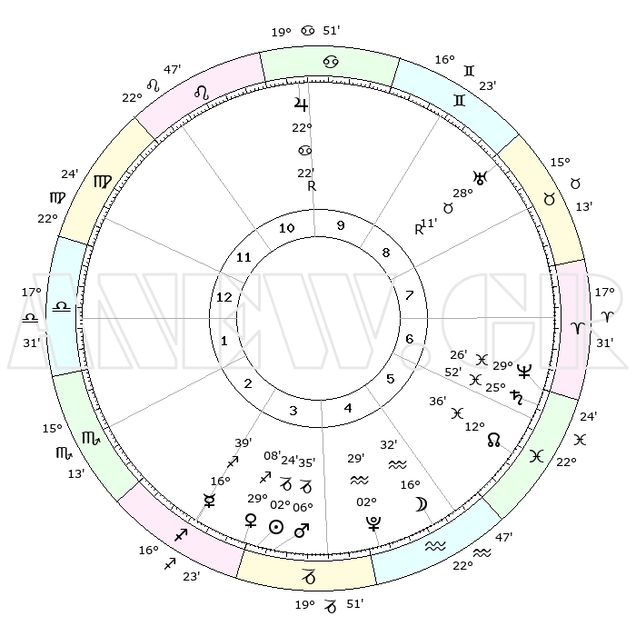 | | ΘΕΣΕΙΣ ΠΛΑΝΗΤΩΝ ΑΣΤΡΟΛΟΓΙΚΟΥ ΧΑΡΤΗ ΤΗΣ ΣΤΙΓΜΗΣ ΑΥΤΗΣ | | | | Πλανήτης | Ζώδιο | Μοίρες | Δεκαήμ. | Σε οίκο | Απόκλιση | | Ακμές των οίκων | | Ηλιος | Αιγόκερως | 02°20' | Πρώτο | 4 | 23 S 25 | | 1ος | 26°39' | Παρθένος | | Σελήνη | Υδροχόος | 15°39' | Δεύτερο | 5 | 18 S 14 | | 2ος | 22°59' | Ζυγός | | Ερμής | Τοξότης | 16°32' | Δεύτερο | 3 | 22 S 22 | | 3ος | 23°18' | Σκορπιός | | Αφροδίτη | Τοξότης | 29°03' | Τρίτο | 4 | 23 S 37 | | 4ος | 26°14' | Τοξότης | | Αρης | Αιγόκερως | 06°31' | Πρώτο | 4 | 24 S 07 | | 5ος | 29°16' | Αιγόκερως | | Δίας | Καρκίνος | 22°22'R | Τρίτο | 10 | 21 N 48 | | 6ος | 29°50' | Υδροχόος | | Κρόνος | Ιχθείς | 25°52' | Τρίτο | 6 | 03 S 44 | | 7ος | 26°39' | Ιχθείς | | Ουρανός | Ταύρος | 28°11'R | Τρίτο | 9 | 19 N 33 | | 8ος | 22°59' | Κριός | | Ποσειδώνας | Ιχθείς | 29°26' | Τρίτο | 7 | 01 S 27 | | 9ος | 23°18' | Ταύρος | | Πλούτωνας | Υδροχόος | 02°29' | Πρώτο | 5 | 23 S 16 | | 10ος | 26°14' | Δίδυμοι | | Β. Δεσμός | Ιχθείς | 12°36' | Δεύτερο | 6 | 06 S 50 | | 11ος | 29°16' | Καρκίνος | | Ωροσκόπος | Παρθένος | 26°39' | Τρίτο | | | 12ος | 29°50' | Λέων | | Μεσουράνημα | Δίδυμοι | 26°14' | Τρίτο | | | |