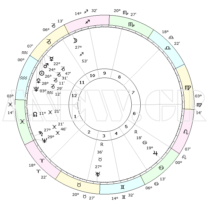 | | ΘΕΣΕΙΣ ΠΛΑΝΗΤΩΝ ΑΣΤΡΟΛΟΓΙΚΟΥ ΧΑΡΤΗ ΤΗΣ ΣΤΙΓΜΗΣ ΑΥΤΗΣ | | | | Πλανήτης | Ζώδιο | Μοίρες | Δεκαήμ. | Σε οίκο | Απόκλιση | | Ακμές των οίκων | | Ηλιος | Αιγόκερως | 26°07' | Τρίτο | 12 | 20 S 55 | | 1ος | 03°23' | Υδροχόος | | Σελήνη | Τοξότης | 27°09' | Τρίτο | 11 | 28 S 18 | | 2ος | 18°00' | Ιχθείς | | Ερμής | Αιγόκερως | 22°41' | Τρίτο | 12 | 23 S 21 | | 3ος | 25°54' | Κριός | | Αφροδίτη | Αιγόκερως | 28°25' | Τρίτο | 12 | 21 S 28 | | 4ος | 23°47' | Ταύρος | | Αρης | Αιγόκερως | 24°28' | Τρίτο | 12 | 22 S 11 | | 5ος | 16°19' | Δίδυμοι | | Δίας | Καρκίνος | 19°19'R | Δεύτερο | 6 | 22 N 19 | | 6ος | 07°52' | Καρκίνος | | Κρόνος | Ιχθείς | 27°21' | Τρίτο | 2 | 03 S 05 | | 7ος | 03°23' | Λέων | | Ουρανός | Ταύρος | 27°37'R | Τρίτο | 4 | 19 N 26 | | 8ος | 18°00' | Παρθένος | | Ποσειδώνας | Ιχθείς | 29°46' | Τρίτο | 2 | 01 S 19 | | 9ος | 25°54' | Ζυγός | | Πλούτωνας | Υδροχόος | 03°12' | Πρώτο | 12 | 23 S 07 | | 10ος | 23°47' | Σκορπιός | | Β. Δεσμός | Ιχθείς | 11°22' | Δεύτερο | 1 | 07 S 18 | | 11ος | 16°19' | Τοξότης | | Ωροσκόπος | Υδροχόος | 03°23' | Πρώτο | | | 12ος | 07°52' | Αιγόκερως | | Μεσουράνημα | Σκορπιός | 23°47' | Τρίτο | | | |