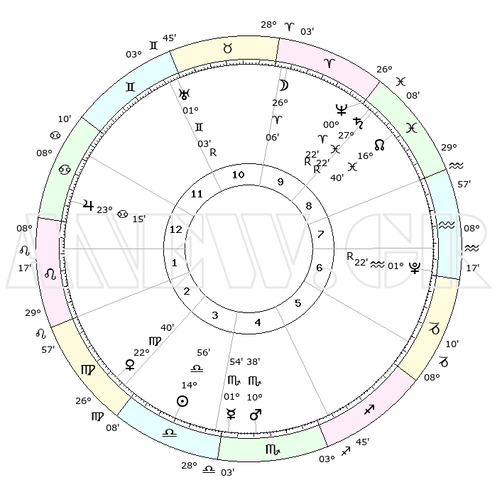 | ΘΕΣΕΙΣ ΠΛΑΝΗΤΩΝ ΑΣΤΡΟΛΟΓΙΚΟΥ ΧΑΡΤΗ ΤΗΣ ΣΤΙΓΜΗΣ ΑΥΤΗΣ | | Πλανήτης | Ζώδιο | Μοίρες | Δεκαήμ. | Σε οίκο | Απόκλιση | | Ακμές των οίκων | Ηλιος | Ζυγός | 14°50' | Δεύτερο | 4 | 05 S 51 | | 1ος | 10°24' | Καρκίνος | Σελήνη | Κριός | 24°42' | Τρίτο | 10 | 12 N 27 | | 2ος | 00°49' | Λέων | Ερμής | Σκορπιός | 01°46' | Πρώτο | 5 | 12 S 57 | | 3ος | 23°29' | Λέων | Αφροδίτη | Παρθένος | 22°33' | Τρίτο | 4 | 04 N 16 | | 4ος | 21°31' | Παρθένος | Αρης | Σκορπιός | 10°34' | Δεύτερο | 5 | 15 S 08 | | 5ος | 26°50' | Ζυγός | Δίας | Καρκίνος | 23°15' | Τρίτο | 1 | 21 N 28 | | 6ος | 05°43' | Τοξότης | Κρόνος | Ιχθείς | 27°23'R | Τρίτο | 10 | 03 S 21 | | 7ος | 10°24' | Αιγόκερως | Ουρανός | Δίδυμοι | 01°03'R | Πρώτο | 11 | 20 N 09 | | 8ος | 00°49' | Υδροχόος | Ποσειδώνας | Κριός | 00°22'R | Πρώτο | 10 | 01 S 07 | | 9ος | 23°29' | Υδροχόος | Πλούτωνας | Υδροχόος | 01°22'R | Πρώτο | 8 | 23 S 32 | | 10ος | 21°31' | Ιχθείς | Β. Δεσμός | Ιχθείς | 16°41' | Δεύτερο | 9 | 05 S 15 | | 11ος | 26°50' | Κριός | Ωροσκόπος | Καρκίνος | 10°24' | Δεύτερο | | | 12ος | 05°43' | Δίδυμοι | Μεσουράνημα | Ιχθείς | 21°31' | Τρίτο | | | |