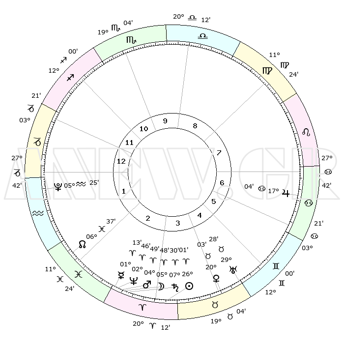 | | ΘΕΣΕΙΣ ΠΛΑΝΗΤΩΝ ΑΣΤΡΟΛΟΓΙΚΟΥ ΧΑΡΤΗ ΤΗΣ ΣΤΙΓΜΗΣ ΑΥΤΗΣ | | | | Πλανήτης | Ζώδιο | Μοίρες | Δεκαήμ. | Σε οίκο | Απόκλιση | | Ακμές των οίκων | | Ηλιος | Κριός | 25°58' | Τρίτο | 4 | 10 N 02 | | 1ος | 03°18' | Αιγόκερως | | Σελήνη | Κριός | 04°52' | Πρώτο | 3 | 04 N 04 | | 2ος | 11°18' | Υδροχόος | | Ερμής | Κριός | 01°08' | Πρώτο | 3 | 01 S 57 | | 3ος | 21°29' | Ιχθείς | | Αφροδίτη | Ταύρος | 19°58' | Δεύτερο | 4 | 17 N 56 | | 4ος | 24°53' | Κριός | | Αρης | Κριός | 04°46' | Πρώτο | 3 | 01 N 00 | | 5ος | 20°41' | Ταύρος | | Δίας | Καρκίνος | 17°04' | Δεύτερο | 7 | 22 N 43 | | 6ος | 12°17' | Δίδυμοι | | Κρόνος | Κριός | 07°30' | Πρώτο | 3 | 01 N 00 | | 7ος | 03°18' | Καρκίνος | | Ουρανός | Ταύρος | 29°28' | Τρίτο | 5 | 19 N 52 | | 8ος | 11°18' | Λέων | | Ποσειδώνας | Κριός | 02°45' | Πρώτο | 3 | 00 S 07 | | 9ος | 21°29' | Παρθένος | | Πλούτωνας | Υδροχόος | 05°25' | Πρώτο | 1 | 22 S 47 | | 10ος | 24°53' | Ζυγός | | Β. Δεσμός | Ιχθείς | 06°37' | Πρώτο | 2 | 09 S 05 | | 11ος | 20°41' | Σκορπιός | | Ωροσκόπος | Αιγόκερως | 03°18' | Πρώτο | | | 12ος | 12°17' | Τοξότης | | Μεσουράνημα | Ζυγός | 24°53' | Τρίτο | | | |
