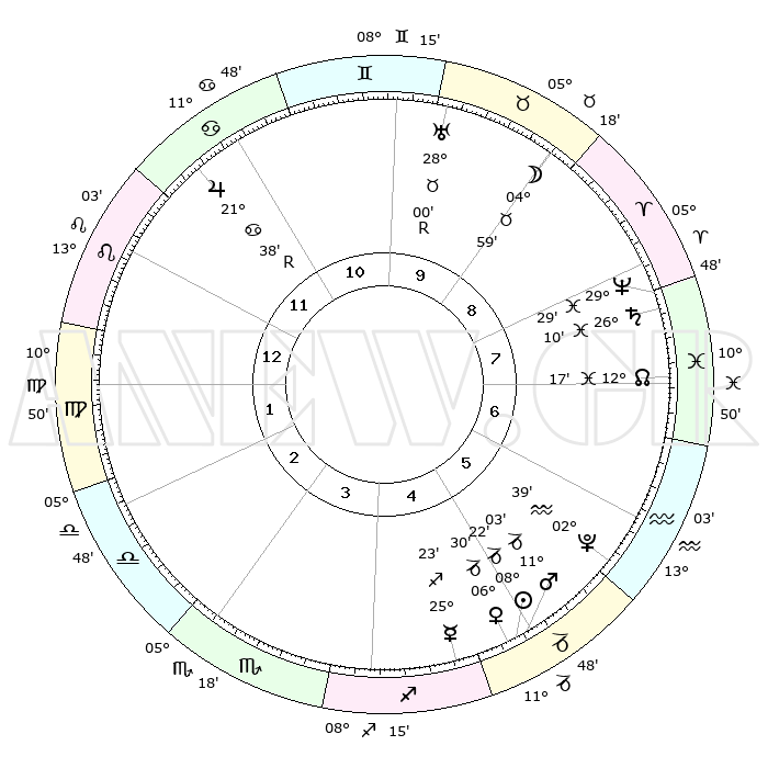 | | ΘΕΣΕΙΣ ΠΛΑΝΗΤΩΝ ΑΣΤΡΟΛΟΓΙΚΟΥ ΧΑΡΤΗ ΤΗΣ ΣΤΙΓΜΗΣ ΑΥΤΗΣ | | | | Πλανήτης | Ζώδιο | Μοίρες | Δεκαήμ. | Σε οίκο | Απόκλιση | | Ακμές των οίκων | | Ηλιος | Αιγόκερως | 08°18' | Πρώτο | 5 | 23 S 10 | | 1ος | 17°60' | Λέων | | Σελήνη | Ταύρος | 03°51' | Πρώτο | 9 | 16 N 35 | | 2ος | 10°36' | Παρθένος | | Ερμής | Τοξότης | 25°16' | Τρίτο | 5 | 23 S 40 | | 3ος | 08°00' | Ζυγός | | Αφροδίτη | Αιγόκερως | 06°24' | Πρώτο | 5 | 23 S 42 | | 4ος | 10°35' | Σκορπιός | | Αρης | Αιγόκερως | 10°59' | Δεύτερο | 5 | 23 S 51 | | 5ος | 15°39' | Τοξότης | | Δίας | Καρκίνος | 21°39'R | Τρίτο | 12 | 21 N 55 | | 6ος | 18°46' | Αιγόκερως | | Κρόνος | Ιχθείς | 26°10' | Τρίτο | 8 | 03 S 36 | | 7ος | 17°60' | Υδροχόος | | Ουρανός | Ταύρος | 28°00'R | Τρίτο | 10 | 19 N 31 | | 8ος | 10°36' | Ιχθείς | | Ποσειδώνας | Ιχθείς | 29°29' | Τρίτο | 8 | 01 S 26 | | 9ος | 08°00' | Κριός | | Πλούτωνας | Υδροχόος | 02°39' | Πρώτο | 6 | 23 S 14 | | 10ος | 10°35' | Ταύρος | | Β. Δεσμός | Ιχθείς | 12°17' | Δεύτερο | 8 | 06 S 57 | | 11ος | 15°39' | Δίδυμοι | | Ωροσκόπος | Λέων | 17°60' | Δεύτερο | | | 12ος | 18°46' | Καρκίνος | | Μεσουράνημα | Ταύρος | 10°35' | Δεύτερο | | | |