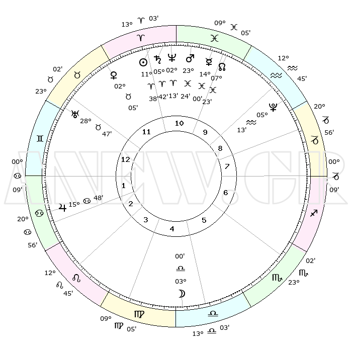 | | ΘΕΣΕΙΣ ΠΛΑΝΗΤΩΝ ΑΣΤΡΟΛΟΓΙΚΟΥ ΧΑΡΤΗ ΤΗΣ ΣΤΙΓΜΗΣ ΑΥΤΗΣ | | | | Πλανήτης | Ζώδιο | Μοίρες | Δεκαήμ. | Σε οίκο | Απόκλιση | | Ακμές των οίκων | | Ηλιος | Κριός | 11°35' | Δεύτερο | 11 | 04 N 35 | | 1ος | 10°37' | Δίδυμοι | | Σελήνη | Ζυγός | 02°18' | Πρώτο | 5 | 02 S 50 | | 2ος | 03°31' | Καρκίνος | | Ερμής | Ιχθείς | 13°57' | Δεύτερο | 10 | 07 S 33 | | 3ος | 24°44' | Καρκίνος | | Αφροδίτη | Ταύρος | 02°01' | Πρώτο | 12 | 11 N 46 | | 4ος | 18°26' | Λέων | | Αρης | Ιχθείς | 23°22' | Τρίτο | 11 | 03 S 36 | | 5ος | 18°50' | Παρθένος | | Δίας | Καρκίνος | 15°48' | Δεύτερο | 2 | 22 N 52 | | 6ος | 28°38' | Ζυγός | | Κρόνος | Κριός | 05°42' | Πρώτο | 11 | 00 N 18 | | 7ος | 10°37' | Τοξότης | | Ουρανός | Ταύρος | 28°47' | Τρίτο | 12 | 19 N 43 | | 8ος | 03°31' | Αιγόκερως | | Ποσειδώνας | Κριός | 02°13' | Πρώτο | 11 | 00 S 19 | | 9ος | 24°44' | Αιγόκερως | | Πλούτωνας | Υδροχόος | 05°13' | Πρώτο | 9 | 22 S 47 | | 10ος | 18°26' | Υδροχόος | | Β. Δεσμός | Ιχθείς | 07°23' | Πρώτο | 10 | 08 S 48 | | 11ος | 18°50' | Ιχθείς | | Ωροσκόπος | Δίδυμοι | 10°37' | Δεύτερο | | | 12ος | 28°38' | Κριός | | Μεσουράνημα | Υδροχόος | 18°26' | Δεύτερο | | | |