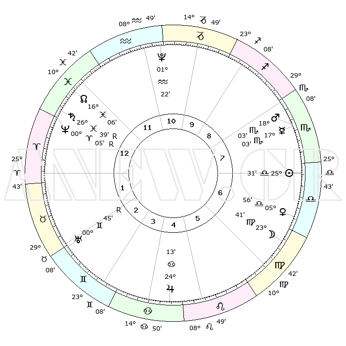 | ΘΕΣΕΙΣ ΠΛΑΝΗΤΩΝ ΑΣΤΡΟΛΟΓΙΚΟΥ ΧΑΡΤΗ ΤΗΣ ΣΤΙΓΜΗΣ ΑΥΤΗΣ | | Πλανήτης | Ζώδιο | Μοίρες | Δεκαήμ. | Σε οίκο | Απόκλιση | | Ακμές των οίκων | Ηλιος | Ζυγός | 25°11' | Τρίτο | 11 | 09 S 45 | | 1ος | 00°26' | Τοξότης | Σελήνη | Παρθένος | 19°33' | Δεύτερο | 10 | 04 N 00 | | 2ος | 01°38' | Αιγόκερως | Ερμής | Σκορπιός | 16°36' | Δεύτερο | 12 | 18 S 47 | | 3ος | 07°24' | Υδροχόος | Αφροδίτη | Ζυγός | 05°31' | Πρώτο | 10 | 00 S 47 | | 4ος | 13°28' | Ιχθείς | Αρης | Σκορπιός | 17°49' | Δεύτερο | 12 | 17 S 23 | | 5ος | 14°26' | Κριός | Δίας | Καρκίνος | 24°12' | Τρίτο | 8 | 21 N 19 | | 6ος | 09°26' | Ταύρος | Κρόνος | Ιχθείς | 26°40'R | Τρίτο | 4 | 03 S 37 | | 7ος | 00°26' | Δίδυμοι | Ουρανός | Δίδυμοι | 00°45'R | Πρώτο | 7 | 20 N 06 | | 8ος | 01°38' | Καρκίνος | Ποσειδώνας | Κριός | 00°06'R | Πρώτο | 4 | 01 S 13 | | 9ος | 07°24' | Λέων | Πλούτωνας | Υδροχόος | 01°22' | Πρώτο | 2 | 23 S 32 | | 10ος | 13°28' | Παρθένος | Β. Δεσμός | Ιχθείς | 16°07' | Δεύτερο | 4 | 05 S 28 | | 11ος | 14°26' | Ζυγός | Ωροσκόπος | Τοξότης | 00°26' | Πρώτο | | | 12ος | 09°26' | Σκορπιός | Μεσουράνημα | Παρθένος | 13°28' | Δεύτερο | | | |