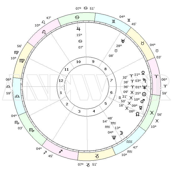 | | ΘΕΣΕΙΣ ΠΛΑΝΗΤΩΝ ΑΣΤΡΟΛΟΓΙΚΟΥ ΧΑΡΤΗ ΤΗΣ ΣΤΙΓΜΗΣ ΑΥΤΗΣ | | | | Πλανήτης | Ζώδιο | Μοίρες | Δεκαήμ. | Σε οίκο | Απόκλιση | | Ακμές των οίκων | | Ηλιος | Ιχθείς | 25°05' | Τρίτο | 7 | 01 S 57 | | 1ος | 19°59' | Παρθένος | | Σελήνη | Υδροχόος | 13°03' | Δεύτερο | 5 | 19 S 06 | | 2ος | 15°47' | Ζυγός | | Ερμής | Ιχθείς | 09°52'R | Πρώτο | 6 | 05 S 47 | | 3ος | 15°47' | Σκορπιός | | Αφροδίτη | Κριός | 11°28' | Δεύτερο | 7 | 03 N 35 | | 4ος | 18°43' | Τοξότης | | Αρης | Ιχθείς | 10°19' | Δεύτερο | 6 | 08 S 42 | | 5ος | 21°54' | Αιγόκερως | | Δίας | Καρκίνος | 15°07' | Δεύτερο | 10 | 22 N 56 | | 6ος | 22°44' | Υδροχόος | | Κρόνος | Κριός | 03°38' | Πρώτο | 7 | 00 S 31 | | 7ος | 19°59' | Ιχθείς | | Ουρανός | Ταύρος | 28°08' | Τρίτο | 9 | 19 N 34 | | 8ος | 15°47' | Κριός | | Ποσειδώνας | Κριός | 01°36' | Πρώτο | 7 | 00 S 34 | | 9ος | 15°47' | Ταύρος | | Πλούτωνας | Υδροχόος | 04°54' | Πρώτο | 5 | 22 S 49 | | 10ος | 18°43' | Δίδυμοι | | Β. Δεσμός | Ιχθείς | 08°16' | Πρώτο | 6 | 08 S 28 | | 11ος | 21°54' | Καρκίνος | | Ωροσκόπος | Παρθένος | 19°59' | Δεύτερο | | | 12ος | 22°44' | Λέων | | Μεσουράνημα | Δίδυμοι | 18°43' | Δεύτερο | | | |