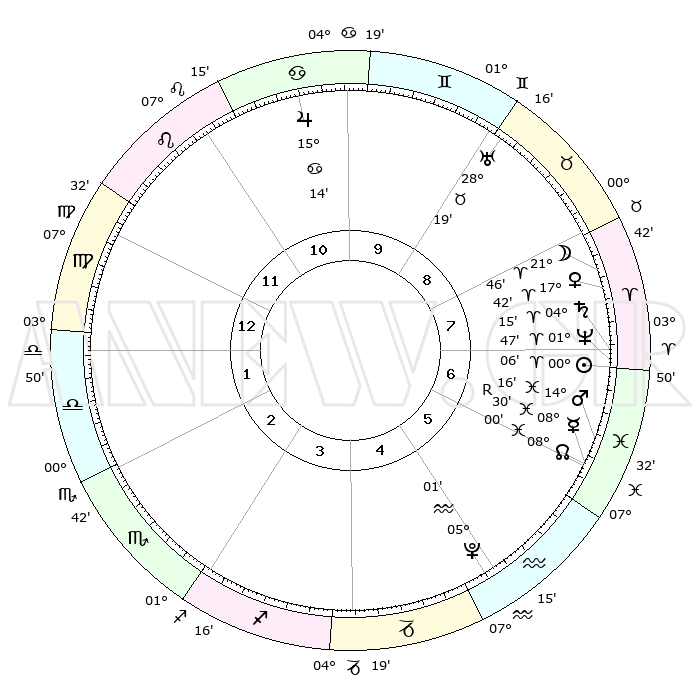 | | ΘΕΣΕΙΣ ΠΛΑΝΗΤΩΝ ΑΣΤΡΟΛΟΓΙΚΟΥ ΧΑΡΤΗ ΤΗΣ ΣΤΙΓΜΗΣ ΑΥΤΗΣ | | | | Πλανήτης | Ζώδιο | Μοίρες | Δεκαήμ. | Σε οίκο | Απόκλιση | | Ακμές των οίκων | | Ηλιος | Κριός | 00°01' | Πρώτο | 7 | 00 N 00 | | 1ος | 12°34' | Παρθένος | | Σελήνη | Κριός | 20°44' | Τρίτο | 8 | 11 N 20 | | 2ος | 07°41' | Ζυγός | | Ερμής | Ιχθείς | 08°30'R | Πρώτο | 6 | 07 S 26 | | 3ος | 07°18' | Σκορπιός | | Αφροδίτη | Κριός | 17°37' | Δεύτερο | 8 | 06 N 06 | | 4ος | 10°15' | Τοξότης | | Αρης | Ιχθείς | 14°13' | Δεύτερο | 7 | 07 S 12 | | 5ος | 13°43' | Αιγόκερως | | Δίας | Καρκίνος | 15°14' | Δεύτερο | 11 | 22 N 55 | | 6ος | 14°52' | Υδροχόος | | Κρόνος | Κριός | 04°15' | Πρώτο | 7 | 00 S 16 | | 7ος | 12°34' | Ιχθείς | | Ουρανός | Ταύρος | 28°18' | Τρίτο | 9 | 19 N 36 | | 8ος | 07°41' | Κριός | | Ποσειδώνας | Κριός | 01°47' | Πρώτο | 7 | 00 S 29 | | 9ος | 07°18' | Ταύρος | | Πλούτωνας | Υδροχόος | 05°00' | Πρώτο | 5 | 22 S 49 | | 10ος | 10°15' | Δίδυμοι | | Β. Δεσμός | Ιχθείς | 08°00' | Πρώτο | 6 | 08 S 34 | | 11ος | 13°43' | Καρκίνος | | Ωροσκόπος | Παρθένος | 12°34' | Δεύτερο | | | 12ος | 14°52' | Λέων | | Μεσουράνημα | Δίδυμοι | 10°15' | Δεύτερο | | | |