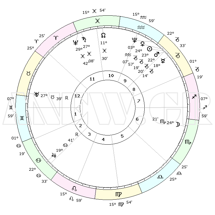 | | ΘΕΣΕΙΣ ΠΛΑΝΗΤΩΝ ΑΣΤΡΟΛΟΓΙΚΟΥ ΧΑΡΤΗ ΤΗΣ ΣΤΙΓΜΗΣ ΑΥΤΗΣ | | | | Πλανήτης | Ζώδιο | Μοίρες | Δεκαήμ. | Σε οίκο | Απόκλιση | | Ακμές των οίκων | | Ηλιος | Αιγόκερως | 22°28' | Τρίτο | 6 | 21 S 34 | | 1ος | 01°30' | Λέων | | Σελήνη | Σκορπιός | 14°29' | Δεύτερο | 4 | 20 S 35 | | 2ος | 22°38' | Λέων | | Ερμής | Αιγόκερως | 16°53' | Δεύτερο | 6 | 23 S 59 | | 3ος | 17°53' | Παρθένος | | Αφροδίτη | Αιγόκερως | 23°54' | Τρίτο | 6 | 22 S 13 | | 4ος | 19°06' | Ζυγός | | Αρης | Αιγόκερως | 21°41' | Τρίτο | 6 | 22 S 38 | | 5ος | 25°06' | Σκορπιός | | Δίας | Καρκίνος | 19°47'R | Δεύτερο | 12 | 22 N 14 | | 6ος | 00°34' | Αιγόκερως | | Κρόνος | Ιχθείς | 27°04' | Τρίτο | 9 | 03 S 12 | | 7ος | 01°30' | Υδροχόος | | Ουρανός | Ταύρος | 27°40'R | Τρίτο | 11 | 19 N 27 | | 8ος | 22°38' | Υδροχόος | | Ποσειδώνας | Ιχθείς | 29°41' | Τρίτο | 9 | 01 S 20 | | 9ος | 17°53' | Ιχθείς | | Πλούτωνας | Υδροχόος | 03°05' | Πρώτο | 7 | 23 S 09 | | 10ος | 19°06' | Κριός | | Β. Δεσμός | Ιχθείς | 11°33' | Δεύτερο | 8 | 07 S 14 | | 11ος | 25°06' | Ταύρος | | Ωροσκόπος | Λέων | 01°30' | Πρώτο | | | 12ος | 00°34' | Καρκίνος | | Μεσουράνημα | Κριός | 19°06' | Δεύτερο | | | |
