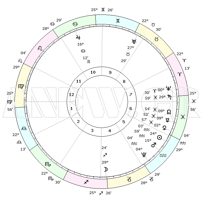 | | ΘΕΣΕΙΣ ΠΛΑΝΗΤΩΝ ΑΣΤΡΟΛΟΓΙΚΟΥ ΧΑΡΤΗ ΤΗΣ ΣΤΙΓΜΗΣ ΑΥΤΗΣ | | | | Πλανήτης | Ζώδιο | Μοίρες | Δεκαήμ. | Σε οίκο | Απόκλιση | | Ακμές των οίκων | | Ηλιος | Υδροχόος | 23°58' | Τρίτο | 6 | 13 S 32 | | 1ος | 01°05' | Παρθένος | | Σελήνη | Τοξότης | 28°23' | Τρίτο | 4 | 28 S 23 | | 2ος | 25°03' | Παρθένος | | Ερμής | Ιχθείς | 09°44' | Πρώτο | 7 | 08 S 19 | | 3ος | 23°49' | Ζυγός | | Αφροδίτη | Ιχθείς | 02°50' | Πρώτο | 7 | 11 S 49 | | 4ος | 26°45' | Σκορπιός | | Αρης | Υδροχόος | 15°54' | Δεύτερο | 6 | 17 S 05 | | 5ος | 00°52' | Αιγόκερως | | Δίας | Καρκίνος | 16°13'R | Δεύτερο | 11 | 22 N 46 | | 6ος | 02°44' | Υδροχόος | | Κρόνος | Ιχθείς | 29°58' | Τρίτο | 8 | 01 S 59 | | 7ος | 01°05' | Ιχθείς | | Ουρανός | Ταύρος | 27°29' | Τρίτο | 10 | 19 N 25 | | 8ος | 25°03' | Ιχθείς | | Ποσειδώνας | Κριός | 00°30' | Πρώτο | 8 | 01 S 00 | | 9ος | 23°49' | Κριός | | Πλούτωνας | Υδροχόος | 04°04' | Πρώτο | 6 | 22 S 57 | | 10ος | 26°45' | Ταύρος | | Β. Δεσμός | Ιχθείς | 09°55' | Πρώτο | 7 | 07 S 51 | | 11ος | 00°52' | Καρκίνος | | Ωροσκόπος | Παρθένος | 01°05' | Πρώτο | | | 12ος | 02°44' | Λέων | | Μεσουράνημα | Ταύρος | 26°45' | Τρίτο | | | |