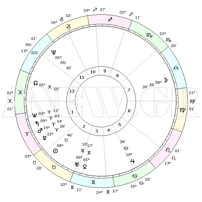| | ΘΕΣΕΙΣ ΠΛΑΝΗΤΩΝ ΑΣΤΡΟΛΟΓΙΚΟΥ ΧΑΡΤΗ ΤΗΣ ΣΤΙΓΜΗΣ ΑΥΤΗΣ | | | | Πλανήτης | Ζώδιο | Μοίρες | Δεκαήμ. | Σε οίκο | Απόκλιση | | Ακμές των οίκων | | Ηλιος | Ταύρος | 08°44' | Πρώτο | 2 | 14 N 25 | | 1ος | 00°57' | Ιχθείς | | Σελήνη | Ζυγός | 08°13' | Πρώτο | 7 | 05 S 39 | | 2ος | 16°18' | Κριός | | Ερμής | Κριός | 22°22' | Τρίτο | 2 | 06 N 44 | | 3ος | 18°49' | Ταύρος | | Αφροδίτη | Δίδυμοι | 05°55' | Πρώτο | 3 | 22 N 05 | | 4ος | 13°08' | Δίδυμοι | | Αρης | Κριός | 14°52' | Δεύτερο | 1 | 05 N 02 | | 5ος | 04°49' | Καρκίνος | | Δίας | Καρκίνος | 18°39' | Δεύτερο | 5 | 22 N 31 | | 6ος | 28°28' | Καρκίνος | | Κρόνος | Κριός | 09°02' | Πρώτο | 1 | 01 N 35 | | 7ος | 00°57' | Παρθένος | | Ουρανός | Δίδυμοι | 00°10' | Πρώτο | 3 | 20 N 01 | | 8ος | 16°18' | Ζυγός | | Ποσειδώνας | Κριός | 03°12' | Πρώτο | 1 | 00 N 04 | | 9ος | 18°49' | Σκορπιός | | Πλούτωνας | Υδροχόος | 05°30' | Πρώτο | 12 | 22 S 49 | | 10ος | 13°08' | Τοξότης | | Β. Δεσμός | Ιχθείς | 05°55' | Πρώτο | 1 | 09 S 20 | | 11ος | 04°49' | Αιγόκερως | | Ωροσκόπος | Ιχθείς | 00°57' | Πρώτο | | | 12ος | 28°28' | Αιγόκερως | | Μεσουράνημα | Τοξότης | 13°08' | Δεύτερο | | | |