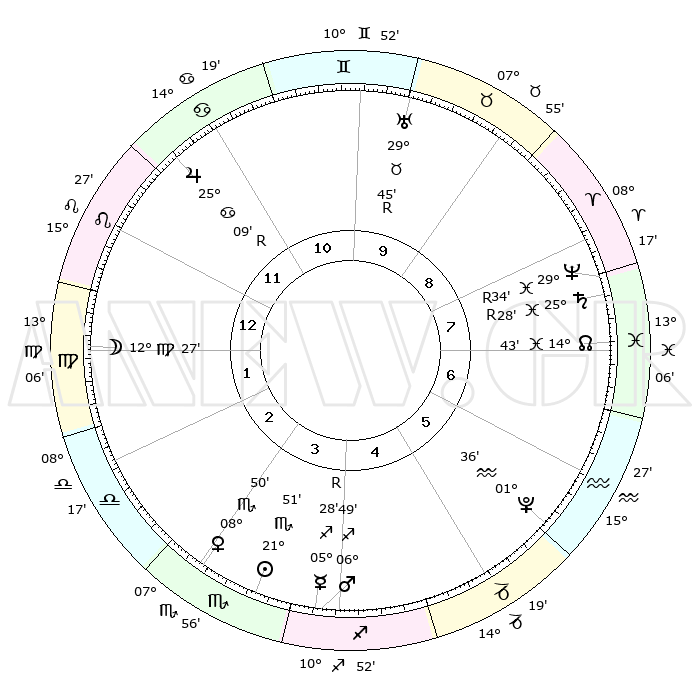 | | ΘΕΣΕΙΣ ΠΛΑΝΗΤΩΝ ΑΣΤΡΟΛΟΓΙΚΟΥ ΧΑΡΤΗ ΤΗΣ ΣΤΙΓΜΗΣ ΑΥΤΗΣ | | | | Πλανήτης | Ζώδιο | Μοίρες | Δεκαήμ. | Σε οίκο | Απόκλιση | | Ακμές των οίκων | | Ηλιος | Σκορπιός | 21°46' | Τρίτο | 4 | 18 S 12 | | 1ος | 20°50' | Λέων | | Σελήνη | Παρθένος | 11°29' | Δεύτερο | 1 | 07 N 38 | | 2ος | 13°44' | Παρθένος | | Ερμής | Τοξότης | 05°31'R | Πρώτο | 4 | 22 S 43 | | 3ος | 11°28' | Ζυγός | | Αφροδίτη | Σκορπιός | 08°44' | Πρώτο | 3 | 13 S 14 | | 4ος | 14°10' | Σκορπιός | | Αρης | Τοξότης | 06°45' | Πρώτο | 4 | 21 S 56 | | 5ος | 19°01' | Τοξότης | | Δίας | Καρκίνος | 25°09'R | Τρίτο | 12 | 21 N 13 | | 6ος | 21°50' | Αιγόκερως | | Κρόνος | Ιχθείς | 25°28'R | Τρίτο | 8 | 04 S 02 | | 7ος | 20°50' | Υδροχόος | | Ουρανός | Ταύρος | 29°45'R | Τρίτο | 10 | 19 N 53 | | 8ος | 13°44' | Ιχθείς | | Ποσειδώνας | Ιχθείς | 29°34'R | Τρίτο | 8 | 01 S 25 | | 9ος | 11°28' | Κριός | | Πλούτωνας | Υδροχόος | 01°36' | Πρώτο | 6 | 23 S 28 | | 10ος | 14°10' | Ταύρος | | Β. Δεσμός | Ιχθείς | 14°43' | Δεύτερο | 8 | 06 S 01 | | 11ος | 19°01' | Δίδυμοι | | Ωροσκόπος | Λέων | 20°50' | Τρίτο | | | 12ος | 21°50' | Καρκίνος | | Μεσουράνημα | Ταύρος | 14°10' | Δεύτερο | | | |