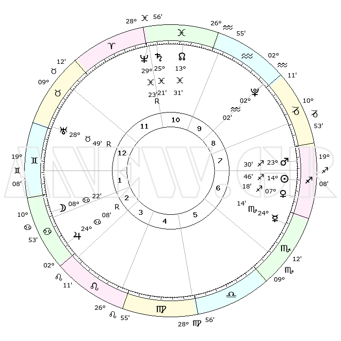 | | ΘΕΣΕΙΣ ΠΛΑΝΗΤΩΝ ΑΣΤΡΟΛΟΓΙΚΟΥ ΧΑΡΤΗ ΤΗΣ ΣΤΙΓΜΗΣ ΑΥΤΗΣ | | | | Πλανήτης | Ζώδιο | Μοίρες | Δεκαήμ. | Σε οίκο | Απόκλιση | | Ακμές των οίκων | | Ηλιος | Τοξότης | 14°40' | Δεύτερο | 8 | 22 S 33 | | 1ος | 12°41' | Ταύρος | | Σελήνη | Καρκίνος | 07°04' | Πρώτο | 3 | 27 N 49 | | 2ος | 11°30' | Δίδυμοι | | Ερμής | Σκορπιός | 24°09' | Τρίτο | 7 | 16 S 26 | | 3ος | 03°55' | Καρκίνος | | Αφροδίτη | Τοξότης | 07°11' | Πρώτο | 7 | 21 S 01 | | 4ος | 25°48' | Καρκίνος | | Αρης | Τοξότης | 23°26' | Τρίτο | 8 | 23 S 59 | | 5ος | 21°39' | Λέων | | Δίας | Καρκίνος | 24°08'R | Τρίτο | 3 | 21 N 27 | | 6ος | 26°54' | Παρθένος | | Κρόνος | Ιχθείς | 25°21' | Τρίτο | 11 | 04 S 00 | | 7ος | 12°41' | Σκορπιός | | Ουρανός | Ταύρος | 28°49'R | Τρίτο | 1 | 19 N 42 | | 8ος | 11°30' | Τοξότης | | Ποσειδώνας | Ιχθείς | 29°23'R | Τρίτο | 12 | 01 S 29 | | 9ος | 03°55' | Αιγόκερως | | Πλούτωνας | Υδροχόος | 02°02' | Πρώτο | 10 | 23 S 22 | | 10ος | 25°48' | Αιγόκερως | | Β. Δεσμός | Ιχθείς | 13°31' | Δεύτερο | 11 | 06 S 29 | | 11ος | 21°39' | Υδροχόος | | Ωροσκόπος | Ταύρος | 12°41' | Δεύτερο | | | 12ος | 26°54' | Ιχθείς | | Μεσουράνημα | Αιγόκερως | 25°48' | Τρίτο | | | |