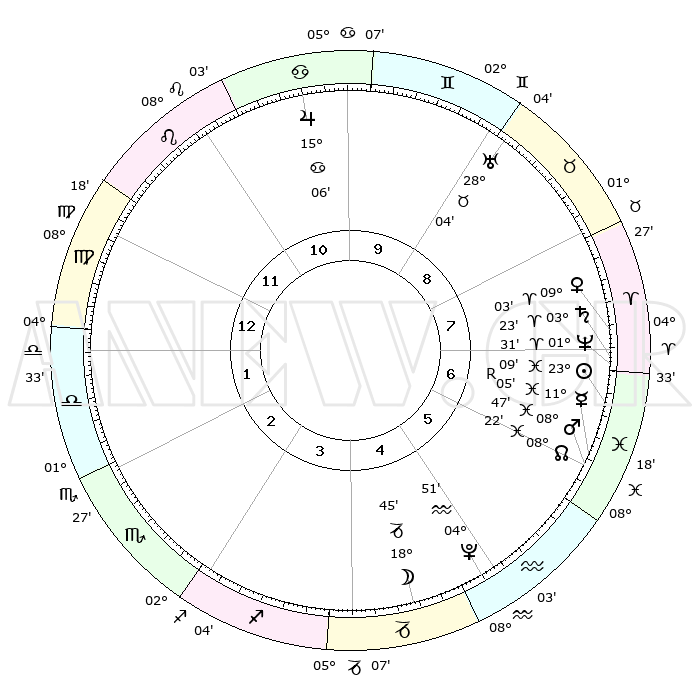| | ΘΕΣΕΙΣ ΠΛΑΝΗΤΩΝ ΑΣΤΡΟΛΟΓΙΚΟΥ ΧΑΡΤΗ ΤΗΣ ΣΤΙΓΜΗΣ ΑΥΤΗΣ | | | | Πλανήτης | Ζώδιο | Μοίρες | Δεκαήμ. | Σε οίκο | Απόκλιση | | Ακμές των οίκων | | Ηλιος | Ιχθείς | 23°05' | Τρίτο | 7 | 02 S 45 | | 1ος | 16°57' | Παρθένος | | Σελήνη | Αιγόκερως | 18°01' | Δεύτερο | 4 | 26 S 17 | | 2ος | 12°28' | Ζυγός | | Ερμής | Ιχθείς | 11°08'R | Δεύτερο | 6 | 04 S 53 | | 3ος | 12°20' | Σκορπιός | | Αφροδίτη | Κριός | 08°59' | Πρώτο | 7 | 02 N 34 | | 4ος | 15°16' | Τοξότης | | Αρης | Ιχθείς | 08°44' | Πρώτο | 6 | 09 S 18 | | 5ος | 18°33' | Αιγόκερως | | Δίας | Καρκίνος | 15°06' | Δεύτερο | 10 | 22 N 56 | | 6ος | 19°30' | Υδροχόος | | Κρόνος | Κριός | 03°23' | Πρώτο | 7 | 00 S 36 | | 7ος | 16°57' | Ιχθείς | | Ουρανός | Ταύρος | 28°04' | Τρίτο | 9 | 19 N 33 | | 8ος | 12°28' | Κριός | | Ποσειδώνας | Κριός | 01°31' | Πρώτο | 7 | 00 S 36 | | 9ος | 12°20' | Ταύρος | | Πλούτωνας | Υδροχόος | 04°51' | Πρώτο | 5 | 22 S 50 | | 10ος | 15°16' | Δίδυμοι | | Β. Δεσμός | Ιχθείς | 08°22' | Πρώτο | 6 | 08 S 26 | | 11ος | 18°33' | Καρκίνος | | Ωροσκόπος | Παρθένος | 16°57' | Δεύτερο | | | 12ος | 19°30' | Λέων | | Μεσουράνημα | Δίδυμοι | 15°16' | Δεύτερο | | | |
