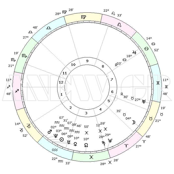 | | ΘΕΣΕΙΣ ΠΛΑΝΗΤΩΝ ΑΣΤΡΟΛΟΓΙΚΟΥ ΧΑΡΤΗ ΤΗΣ ΣΤΙΓΜΗΣ ΑΥΤΗΣ | | | | Πλανήτης | Ζώδιο | Μοίρες | Δεκαήμ. | Σε οίκο | Απόκλιση | | Ακμές των οίκων | | Ηλιος | Υδροχόος | 06°02' | Πρώτο | 3 | 18 S 46 | | 1ος | 18°10' | Σκορπιός | | Σελήνη | Ταύρος | 03°27' | Πρώτο | 6 | 16 N 37 | | 2ος | 17°56' | Τοξότης | | Ερμής | Υδροχόος | 09°01' | Πρώτο | 3 | 20 S 00 | | 3ος | 21°49' | Αιγόκερως | | Αφροδίτη | Υδροχόος | 10°39' | Δεύτερο | 3 | 18 S 46 | | 4ος | 27°19' | Υδροχόος | | Αρης | Υδροχόος | 02°03' | Πρώτο | 3 | 20 S 42 | | 5ος | 29°31' | Ιχθείς | | Δίας | Καρκίνος | 18°03'R | Δεύτερο | 8 | 22 N 30 | | 6ος | 26°10' | Κριός | | Κρόνος | Ιχθείς | 28°11' | Τρίτο | 4 | 02 S 44 | | 7ος | 18°10' | Ταύρος | | Ουρανός | Ταύρος | 27°30'R | Τρίτο | 7 | 19 N 25 | | 8ος | 17°55' | Δίδυμοι | | Ποσειδώνας | Ιχθείς | 29°59' | Τρίτο | 5 | 01 S 13 | | 9ος | 21°50' | Καρκίνος | | Πλούτωνας | Υδροχόος | 03°31' | Πρώτο | 3 | 23 S 04 | | 10ος | 27°19' | Λέων | | Β. Δεσμός | Ιχθείς | 10°51' | Δεύτερο | 4 | 07 S 30 | | 11ος | 29°31' | Παρθένος | | Ωροσκόπος | Σκορπιός | 18°10' | Δεύτερο | | | 12ος | 26°10' | Ζυγός | | Μεσουράνημα | Λέων | 27°19' | Τρίτο | | | |
