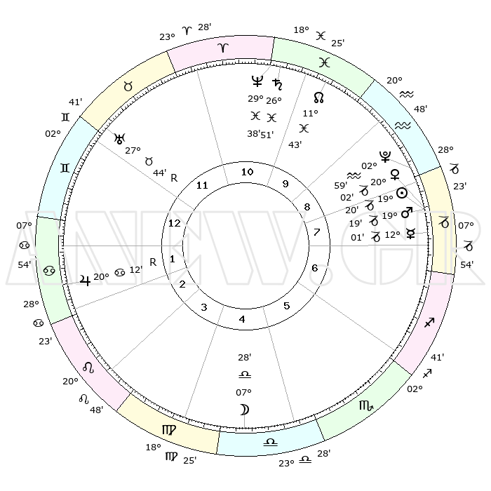 | | ΘΕΣΕΙΣ ΠΛΑΝΗΤΩΝ ΑΣΤΡΟΛΟΓΙΚΟΥ ΧΑΡΤΗ ΤΗΣ ΣΤΙΓΜΗΣ ΑΥΤΗΣ | | | | Πλανήτης | Ζώδιο | Μοίρες | Δεκαήμ. | Σε οίκο | Απόκλιση | | Ακμές των οίκων | | Ηλιος | Αιγόκερως | 18°35' | Δεύτερο | 4 | 22 S 09 | | 1ος | 24°60' | Παρθένος | | Σελήνη | Παρθένος | 28°16' | Τρίτο | 1 | 00 S 46 | | 2ος | 21°12' | Ζυγός | | Ερμής | Αιγόκερως | 10°51' | Δεύτερο | 4 | 24 S 20 | | 3ος | 21°26' | Σκορπιός | | Αφροδίτη | Αιγόκερως | 19°07' | Δεύτερο | 4 | 22 S 51 | | 4ος | 24°23' | Τοξότης | | Αρης | Αιγόκερως | 18°45' | Δεύτερο | 4 | 23 S 03 | | 5ος | 27°26' | Αιγόκερως | | Δίας | Καρκίνος | 20°18'R | Τρίτο | 10 | 22 N 09 | | 6ος | 28°04' | Υδροχόος | | Κρόνος | Ιχθείς | 26°47' | Τρίτο | 7 | 03 S 20 | | 7ος | 24°60' | Ιχθείς | | Ουρανός | Ταύρος | 27°45'R | Τρίτο | 9 | 19 N 28 | | 8ος | 21°12' | Κριός | | Ποσειδώνας | Ιχθείς | 29°37' | Τρίτο | 7 | 01 S 22 | | 9ος | 21°26' | Ταύρος | | Πλούτωνας | Υδροχόος | 02°58' | Πρώτο | 5 | 23 S 10 | | 10ος | 24°23' | Δίδυμοι | | Β. Δεσμός | Ιχθείς | 11°45' | Δεύτερο | 6 | 07 S 09 | | 11ος | 27°26' | Καρκίνος | | Ωροσκόπος | Παρθένος | 24°60' | Τρίτο | | | 12ος | 28°04' | Λέων | | Μεσουράνημα | Δίδυμοι | 24°23' | Τρίτο | | | |
