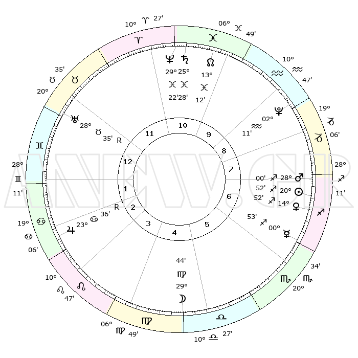 | | ΘΕΣΕΙΣ ΠΛΑΝΗΤΩΝ ΑΣΤΡΟΛΟΓΙΚΟΥ ΧΑΡΤΗ ΤΗΣ ΣΤΙΓΜΗΣ ΑΥΤΗΣ | | | | Πλανήτης | Ζώδιο | Μοίρες | Δεκαήμ. | Σε οίκο | Απόκλιση | | Ακμές των οίκων | | Ηλιος | Τοξότης | 20°47' | Τρίτο | 7 | 23 S 07 | | 1ος | 26°28' | Ταύρος | | Σελήνη | Παρθένος | 28°43' | Τρίτο | 5 | 00 S 44 | | 2ος | 22°01' | Δίδυμοι | | Ερμής | Τοξότης | 00°47' | Πρώτο | 7 | 18 S 31 | | 3ος | 13°34' | Καρκίνος | | Αφροδίτη | Τοξότης | 14°45' | Δεύτερο | 7 | 22 S 18 | | 4ος | 06°05' | Λέων | | Αρης | Τοξότης | 27°56' | Τρίτο | 8 | 24 S 10 | | 5ος | 03°57' | Παρθένος | | Δίας | Καρκίνος | 23°36'R | Τρίτο | 3 | 21 N 33 | | 6ος | 11°49' | Ζυγός | | Κρόνος | Ιχθείς | 25°28' | Τρίτο | 11 | 03 S 56 | | 7ος | 26°28' | Σκορπιός | | Ουρανός | Ταύρος | 28°35'R | Τρίτο | 1 | 19 N 39 | | 8ος | 22°01' | Τοξότης | | Ποσειδώνας | Ιχθείς | 29°22' | Τρίτο | 11 | 01 S 29 | | 9ος | 13°34' | Αιγόκερως | | Πλούτωνας | Υδροχόος | 02°11' | Πρώτο | 9 | 23 S 20 | | 10ος | 06°05' | Υδροχόος | | Β. Δεσμός | Ιχθείς | 13°12' | Δεύτερο | 11 | 06 S 36 | | 11ος | 03°57' | Ιχθείς | | Ωροσκόπος | Ταύρος | 26°28' | Τρίτο | | | 12ος | 11°49' | Κριός | | Μεσουράνημα | Υδροχόος | 06°05' | Πρώτο | | | |