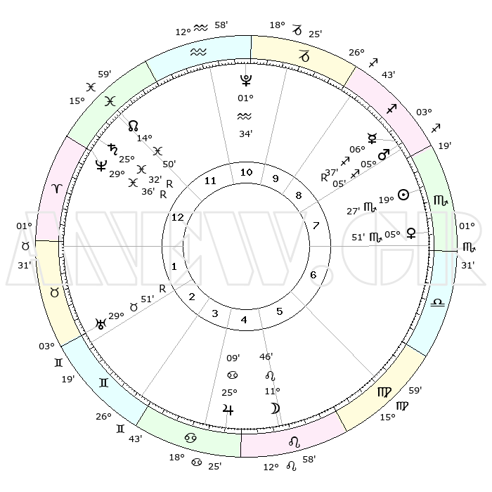 | | ΘΕΣΕΙΣ ΠΛΑΝΗΤΩΝ ΑΣΤΡΟΛΟΓΙΚΟΥ ΧΑΡΤΗ ΤΗΣ ΣΤΙΓΜΗΣ ΑΥΤΗΣ | | | | Πλανήτης | Ζώδιο | Μοίρες | Δεκαήμ. | Σε οίκο | Απόκλιση | | Ακμές των οίκων | | Ηλιος | Σκορπιός | 19°22' | Δεύτερο | 8 | 17 S 34 | | 1ος | 13°58' | Ιχθείς | | Σελήνη | Λέων | 10°40' | Δεύτερο | 6 | 20 N 24 | | 2ος | 27°37' | Κριός | | Ερμής | Τοξότης | 06°38'R | Πρώτο | 9 | 23 S 26 | | 3ος | 27°42' | Ταύρος | | Αφροδίτη | Σκορπιός | 05°44' | Πρώτο | 8 | 12 S 13 | | 4ος | 20°55' | Δίδυμοι | | Αρης | Τοξότης | 05°02' | Πρώτο | 9 | 21 S 37 | | 5ος | 12°43' | Καρκίνος | | Δίας | Καρκίνος | 25°09' | Τρίτο | 5 | 21 N 12 | | 6ος | 07°52' | Λέων | | Κρόνος | Ιχθείς | 25°32'R | Τρίτο | 1 | 04 S 01 | | 7ος | 13°58' | Παρθένος | | Ουρανός | Ταύρος | 29°51'R | Τρίτο | 3 | 19 N 55 | | 8ος | 27°37' | Ζυγός | | Ποσειδώνας | Ιχθείς | 29°36'R | Τρίτο | 1 | 01 S 25 | | 9ος | 27°42' | Σκορπιός | | Πλούτωνας | Υδροχόος | 01°34' | Πρώτο | 11 | 23 S 29 | | 10ος | 20°55' | Τοξότης | | Β. Δεσμός | Ιχθείς | 14°51' | Δεύτερο | 1 | 05 S 58 | | 11ος | 12°43' | Αιγόκερως | | Ωροσκόπος | Ιχθείς | 13°58' | Δεύτερο | | | 12ος | 07°52' | Υδροχόος | | Μεσουράνημα | Τοξότης | 20°55' | Τρίτο | | | |