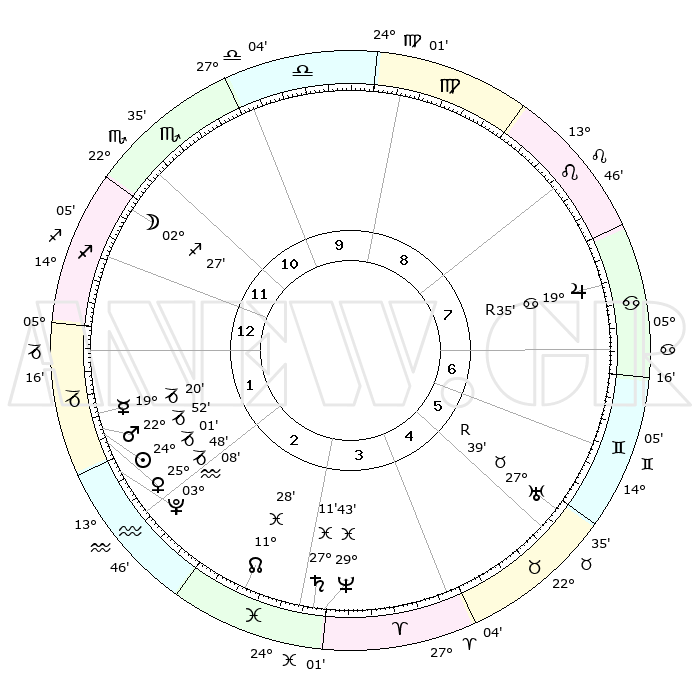 | | ΘΕΣΕΙΣ ΠΛΑΝΗΤΩΝ ΑΣΤΡΟΛΟΓΙΚΟΥ ΧΑΡΤΗ ΤΗΣ ΣΤΙΓΜΗΣ ΑΥΤΗΣ | | | | Πλανήτης | Ζώδιο | Μοίρες | Δεκαήμ. | Σε οίκο | Απόκλιση | | Ακμές των οίκων | | Ηλιος | Αιγόκερως | 23°52' | Τρίτο | 2 | 21 S 20 | | 1ος | 21°45' | Σκορπιός | | Σελήνη | Τοξότης | 00°46' | Πρώτο | 1 | 25 S 15 | | 2ος | 21°52' | Τοξότης | | Ερμής | Αιγόκερως | 19°06' | Δεύτερο | 2 | 23 S 47 | | 3ος | 26°17' | Αιγόκερως | | Αφροδίτη | Αιγόκερως | 25°38' | Τρίτο | 2 | 21 S 57 | | 4ος | 01°59' | Ιχθείς | | Αρης | Αιγόκερως | 22°45' | Τρίτο | 2 | 22 S 28 | | 5ος | 03°54' | Κριός | | Δίας | Καρκίνος | 19°36'R | Δεύτερο | 8 | 22 N 16 | | 6ος | 00°04' | Ταύρος | | Κρόνος | Ιχθείς | 27°10' | Τρίτο | 4 | 03 S 10 | | 7ος | 21°45' | Ταύρος | | Ουρανός | Ταύρος | 27°39'R | Τρίτο | 7 | 19 N 26 | | 8ος | 21°52' | Δίδυμοι | | Ποσειδώνας | Ιχθείς | 29°43' | Τρίτο | 4 | 01 S 20 | | 9ος | 26°17' | Καρκίνος | | Πλούτωνας | Υδροχόος | 03°08' | Πρώτο | 3 | 23 S 08 | | 10ος | 01°59' | Παρθένος | | Β. Δεσμός | Ιχθείς | 11°29' | Δεύτερο | 4 | 07 S 15 | | 11ος | 03°54' | Ζυγός | | Ωροσκόπος | Σκορπιός | 21°45' | Τρίτο | | | 12ος | 00°04' | Σκορπιός | | Μεσουράνημα | Παρθένος | 01°59' | Πρώτο | | | |