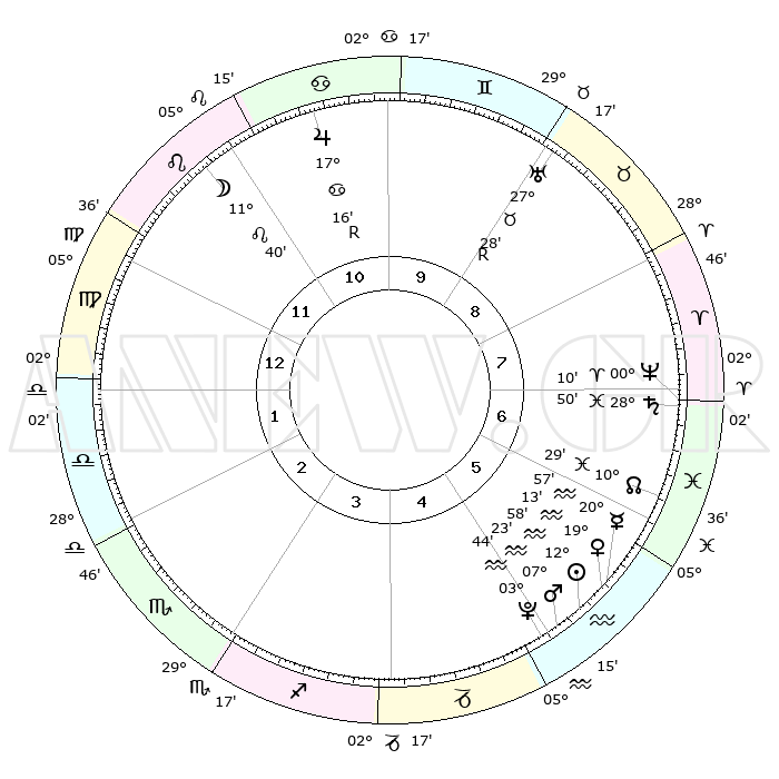 | | ΘΕΣΕΙΣ ΠΛΑΝΗΤΩΝ ΑΣΤΡΟΛΟΓΙΚΟΥ ΧΑΡΤΗ ΤΗΣ ΣΤΙΓΜΗΣ ΑΥΤΗΣ | | | | Πλανήτης | Ζώδιο | Μοίρες | Δεκαήμ. | Σε οίκο | Απόκλιση | | Ακμές των οίκων | | Ηλιος | Υδροχόος | 12°54' | Δεύτερο | 5 | 16 S 56 | | 1ος | 12°24' | Παρθένος | | Σελήνη | Λέων | 10°43' | Δεύτερο | 11 | 19 N 56 | | 2ος | 07°30' | Ζυγός | | Ερμής | Υδροχόος | 20°50' | Τρίτο | 6 | 16 S 17 | | 3ος | 07°07' | Σκορπιός | | Αφροδίτη | Υδροχόος | 19°08' | Δεύτερο | 6 | 16 S 23 | | 4ος | 10°03' | Τοξότης | | Αρης | Υδροχόος | 07°20' | Πρώτο | 5 | 19 S 27 | | 5ος | 13°32' | Αιγόκερως | | Δίας | Καρκίνος | 17°16'R | Δεύτερο | 11 | 22 N 37 | | 6ος | 14°42' | Υδροχόος | | Κρόνος | Ιχθείς | 28°50' | Τρίτο | 7 | 02 S 27 | | 7ος | 12°24' | Ιχθείς | | Ουρανός | Ταύρος | 27°28'R | Τρίτο | 9 | 19 N 24 | | 8ος | 07°30' | Κριός | | Ποσειδώνας | Κριός | 00°10' | Πρώτο | 7 | 01 S 08 | | 9ος | 07°07' | Ταύρος | | Πλούτωνας | Υδροχόος | 03°44' | Πρώτο | 5 | 23 S 01 | | 10ος | 10°03' | Δίδυμοι | | Β. Δεσμός | Ιχθείς | 10°29' | Δεύτερο | 6 | 07 S 38 | | 11ος | 13°32' | Καρκίνος | | Ωροσκόπος | Παρθένος | 12°24' | Δεύτερο | | | 12ος | 14°42' | Λέων | | Μεσουράνημα | Δίδυμοι | 10°03' | Δεύτερο | | | |