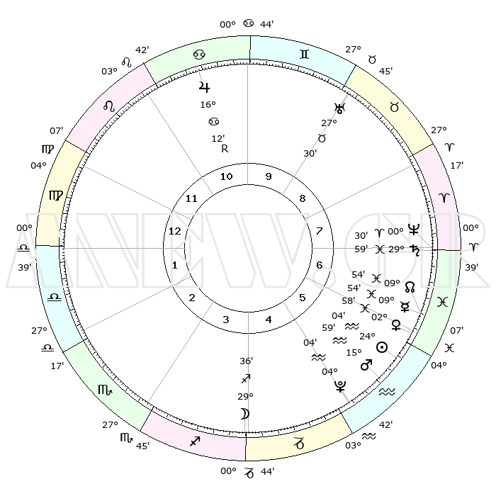 | | ΘΕΣΕΙΣ ΠΛΑΝΗΤΩΝ ΑΣΤΡΟΛΟΓΙΚΟΥ ΧΑΡΤΗ ΤΗΣ ΣΤΙΓΜΗΣ ΑΥΤΗΣ | | | | Πλανήτης | Ζώδιο | Μοίρες | Δεκαήμ. | Σε οίκο | Απόκλιση | | Ακμές των οίκων | | Ηλιος | Υδροχόος | 23°60' | Τρίτο | 6 | 13 S 31 | | 1ος | 07°22' | Παρθένος | | Σελήνη | Τοξότης | 28°39' | Τρίτο | 4 | 28 S 23 | | 2ος | 01°59' | Ζυγός | | Ερμής | Ιχθείς | 09°46' | Πρώτο | 7 | 08 S 18 | | 3ος | 01°15' | Σκορπιός | | Αφροδίτη | Ιχθείς | 02°52' | Πρώτο | 6 | 11 S 49 | | 4ος | 04°12' | Τοξότης | | Αρης | Υδροχόος | 15°56' | Δεύτερο | 6 | 17 S 05 | | 5ος | 07°56' | Αιγόκερως | | Δίας | Καρκίνος | 16°12'R | Δεύτερο | 11 | 22 N 46 | | 6ος | 09°23' | Υδροχόος | | Κρόνος | Ιχθείς | 29°58' | Τρίτο | 7 | 01 S 59 | | 7ος | 07°22' | Ιχθείς | | Ουρανός | Ταύρος | 27°29' | Τρίτο | 9 | 19 N 25 | | 8ος | 01°59' | Κριός | | Ποσειδώνας | Κριός | 00°30' | Πρώτο | 7 | 01 S 00 | | 9ος | 01°15' | Ταύρος | | Πλούτωνας | Υδροχόος | 04°04' | Πρώτο | 5 | 22 S 57 | | 10ος | 04°12' | Δίδυμοι | | Β. Δεσμός | Ιχθείς | 09°54' | Πρώτο | 7 | 07 S 51 | | 11ος | 07°56' | Καρκίνος | | Ωροσκόπος | Παρθένος | 07°22' | Πρώτο | | | 12ος | 09°23' | Λέων | | Μεσουράνημα | Δίδυμοι | 04°12' | Πρώτο | | | |