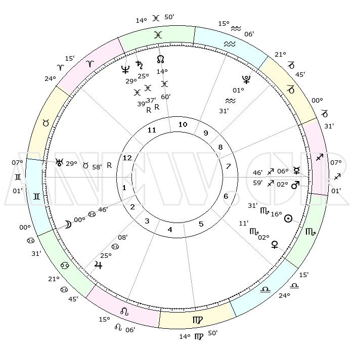 | | ΘΕΣΕΙΣ ΠΛΑΝΗΤΩΝ ΑΣΤΡΟΛΟΓΙΚΟΥ ΧΑΡΤΗ ΤΗΣ ΣΤΙΓΜΗΣ ΑΥΤΗΣ | | | | Πλανήτης | Ζώδιο | Μοίρες | Δεκαήμ. | Σε οίκο | Απόκλιση | | Ακμές των οίκων | | Ηλιος | Σκορπιός | 16°27' | Δεύτερο | 7 | 16 S 45 | | 1ος | 03°04' | Ταύρος | | Σελήνη | Δίδυμοι | 29°40' | Τρίτο | 3 | 28 N 22 | | 2ος | 04°26' | Δίδυμοι | | Ερμής | Τοξότης | 06°46' | Πρώτο | 8 | 23 S 55 | | 3ος | 27°42' | Δίδυμοι | | Αφροδίτη | Σκορπιός | 02°06' | Πρώτο | 6 | 10 S 56 | | 4ος | 19°24' | Καρκίνος | | Αρης | Τοξότης | 02°56' | Πρώτο | 7 | 21 S 12 | | 5ος | 14°07' | Λέων | | Δίας | Καρκίνος | 25°08' | Τρίτο | 4 | 21 N 12 | | 6ος | 17°26' | Παρθένος | | Κρόνος | Ιχθείς | 25°37'R | Τρίτο | 12 | 03 S 59 | | 7ος | 03°04' | Σκορπιός | | Ουρανός | Ταύρος | 29°58'R | Τρίτο | 1 | 19 N 56 | | 8ος | 04°26' | Τοξότης | | Ποσειδώνας | Ιχθείς | 29°39'R | Τρίτο | 12 | 01 S 24 | | 9ος | 27°42' | Τοξότης | | Πλούτωνας | Υδροχόος | 01°31' | Πρώτο | 10 | 23 S 30 | | 10ος | 19°24' | Αιγόκερως | | Β. Δεσμός | Ιχθείς | 14°60' | Δεύτερο | 11 | 05 S 55 | | 11ος | 14°07' | Υδροχόος | | Ωροσκόπος | Ταύρος | 03°04' | Πρώτο | | | 12ος | 17°26' | Ιχθείς | | Μεσουράνημα | Αιγόκερως | 19°24' | Δεύτερο | | | |