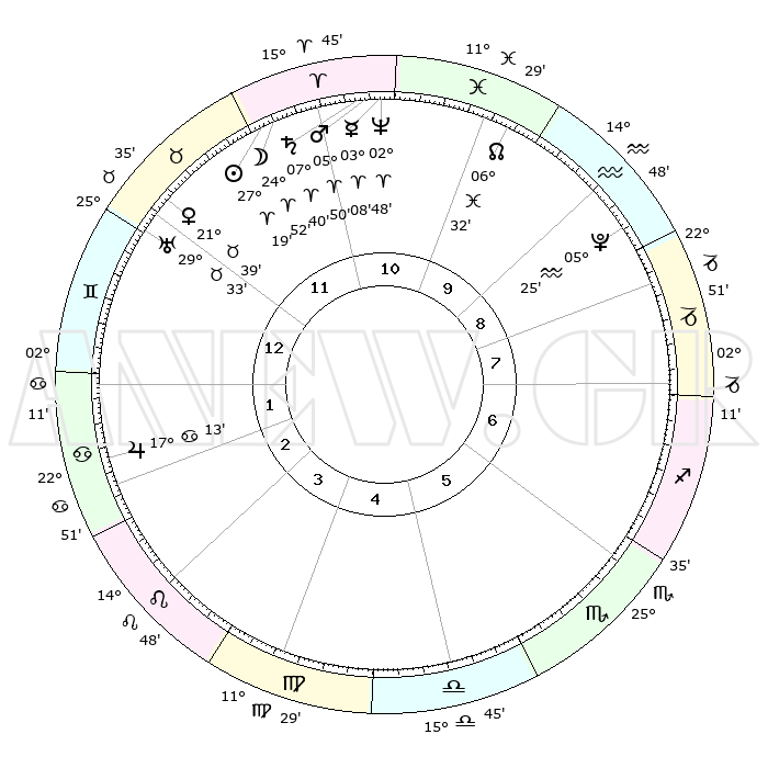 | | ΘΕΣΕΙΣ ΠΛΑΝΗΤΩΝ ΑΣΤΡΟΛΟΓΙΚΟΥ ΧΑΡΤΗ ΤΗΣ ΣΤΙΓΜΗΣ ΑΥΤΗΣ | | | | Πλανήτης | Ζώδιο | Μοίρες | Δεκαήμ. | Σε οίκο | Απόκλιση | | Ακμές των οίκων | | Ηλιος | Κριός | 27°16' | Τρίτο | 11 | 10 N 30 | | 1ος | 16°37' | Δίδυμοι | | Σελήνη | Κριός | 24°12' | Τρίτο | 11 | 12 N 49 | | 2ος | 08°40' | Καρκίνος | | Ερμής | Κριός | 03°04' | Πρώτο | 11 | 01 S 12 | | 3ος | 29°55' | Καρκίνος | | Αφροδίτη | Ταύρος | 21°36' | Τρίτο | 12 | 18 N 26 | | 4ος | 24°19' | Λέων | | Αρης | Κριός | 05°48' | Πρώτο | 11 | 01 N 25 | | 5ος | 25°51' | Παρθένος | | Δίας | Καρκίνος | 17°12' | Δεύτερο | 2 | 22 N 42 | | 6ος | 06°03' | Σκορπιός | | Κρόνος | Κριός | 07°39' | Πρώτο | 11 | 01 N 04 | | 7ος | 16°37' | Τοξότης | | Ουρανός | Ταύρος | 29°32' | Τρίτο | 12 | 19 N 53 | | 8ος | 08°40' | Αιγόκερως | | Ποσειδώνας | Κριός | 02°48' | Πρώτο | 11 | 00 S 05 | | 9ος | 29°55' | Αιγόκερως | | Πλούτωνας | Υδροχόος | 05°25' | Πρώτο | 9 | 22 S 47 | | 10ος | 24°19' | Υδροχόος | | Β. Δεσμός | Ιχθείς | 06°33' | Πρώτο | 10 | 09 S 06 | | 11ος | 25°51' | Ιχθείς | | Ωροσκόπος | Δίδυμοι | 16°37' | Δεύτερο | | | 12ος | 06°03' | Ταύρος | | Μεσουράνημα | Υδροχόος | 24°19' | Τρίτο | | | |