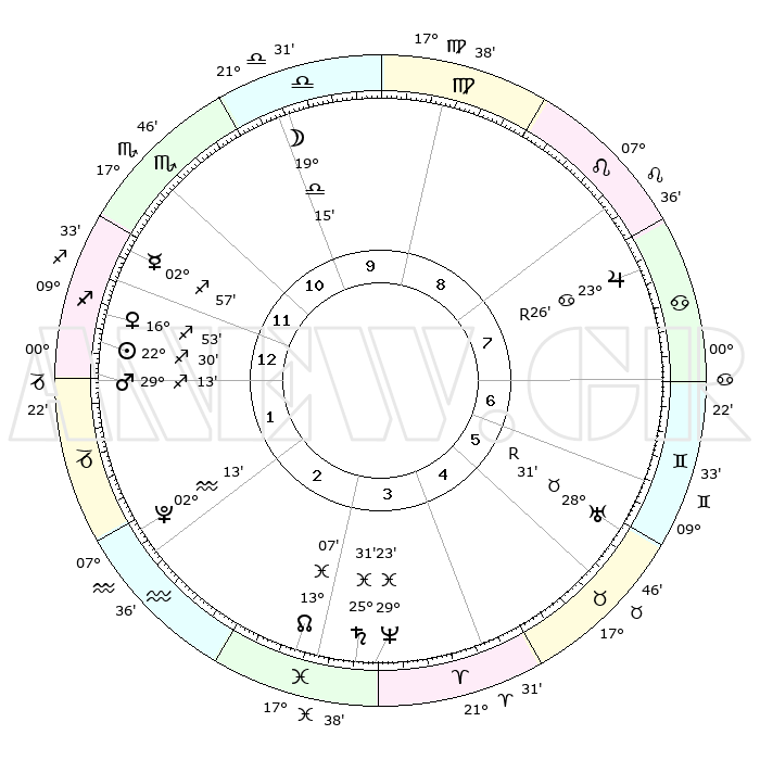 | | ΘΕΣΕΙΣ ΠΛΑΝΗΤΩΝ ΑΣΤΡΟΛΟΓΙΚΟΥ ΧΑΡΤΗ ΤΗΣ ΣΤΙΓΜΗΣ ΑΥΤΗΣ | | | | Πλανήτης | Ζώδιο | Μοίρες | Δεκαήμ. | Σε οίκο | Απόκλιση | | Ακμές των οίκων | | Ηλιος | Τοξότης | 22°18' | Τρίτο | 2 | 23 S 13 | | 1ος | 02°39' | Σκορπιός | | Σελήνη | Ζυγός | 16°56' | Δεύτερο | 12 | 09 S 14 | | 2ος | 01°14' | Τοξότης | | Ερμής | Τοξότης | 02°42' | Πρώτο | 2 | 19 S 04 | | 3ος | 03°24' | Αιγόκερως | | Αφροδίτη | Τοξότης | 16°39' | Δεύτερο | 2 | 22 S 34 | | 4ος | 07°47' | Υδροχόος | | Αρης | Τοξότης | 29°04' | Τρίτο | 2 | 24 S 12 | | 5ος | 10°40' | Ιχθείς | | Δίας | Καρκίνος | 23°28'R | Τρίτο | 9 | 21 N 35 | | 6ος | 09°05' | Κριός | | Κρόνος | Ιχθείς | 25°30' | Τρίτο | 5 | 03 S 55 | | 7ος | 02°39' | Ταύρος | | Ουρανός | Ταύρος | 28°32'R | Τρίτο | 7 | 19 N 38 | | 8ος | 01°14' | Δίδυμοι | | Ποσειδώνας | Ιχθείς | 29°23' | Τρίτο | 5 | 01 S 29 | | 9ος | 03°24' | Καρκίνος | | Πλούτωνας | Υδροχόος | 02°13' | Πρώτο | 3 | 23 S 20 | | 10ος | 07°47' | Λέων | | Β. Δεσμός | Ιχθείς | 13°07' | Δεύτερο | 5 | 06 S 38 | | 11ος | 10°40' | Παρθένος | | Ωροσκόπος | Σκορπιός | 02°39' | Πρώτο | | | 12ος | 09°05' | Ζυγός | | Μεσουράνημα | Λέων | 07°47' | Πρώτο | | | |