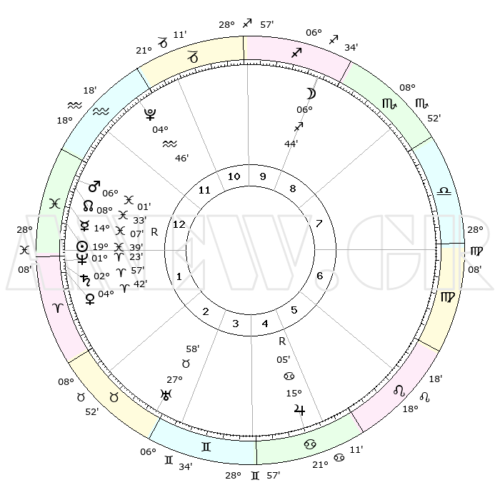 | | ΘΕΣΕΙΣ ΠΛΑΝΗΤΩΝ ΑΣΤΡΟΛΟΓΙΚΟΥ ΧΑΡΤΗ ΤΗΣ ΣΤΙΓΜΗΣ ΑΥΤΗΣ | | | | Πλανήτης | Ζώδιο | Μοίρες | Δεκαήμ. | Σε οίκο | Απόκλιση | | Ακμές των οίκων | | Ηλιος | Ιχθείς | 19°35' | Δεύτερο | 1 | 04 S 08 | | 1ος | 21°15' | Υδροχόος | | Σελήνη | Τοξότης | 05°57' | Πρώτο | 9 | 26 S 29 | | 2ος | 07°03' | Κριός | | Ερμής | Ιχθείς | 14°11'R | Δεύτερο | 1 | 03 S 07 | | 3ος | 11°31' | Ταύρος | | Αφροδίτη | Κριός | 04°37' | Πρώτο | 1 | 00 N 45 | | 4ος | 06°53' | Δίδυμοι | | Αρης | Ιχθείς | 05°58' | Πρώτο | 1 | 10 S 20 | | 5ος | 28°40' | Δίδυμοι | | Δίας | Καρκίνος | 15°05'R | Δεύτερο | 5 | 22 N 56 | | 6ος | 21°24' | Καρκίνος | | Κρόνος | Κριός | 02°57' | Πρώτο | 1 | 00 S 47 | | 7ος | 21°15' | Λέων | | Ουρανός | Ταύρος | 27°58' | Τρίτο | 3 | 19 N 32 | | 8ος | 07°03' | Ζυγός | | Ποσειδώνας | Κριός | 01°23' | Πρώτο | 1 | 00 S 39 | | 9ος | 11°31' | Σκορπιός | | Πλούτωνας | Υδροχόος | 04°46' | Πρώτο | 12 | 22 S 50 | | 10ος | 06°53' | Τοξότης | | Β. Δεσμός | Ιχθείς | 08°34' | Πρώτο | 1 | 08 S 21 | | 11ος | 28°40' | Τοξότης | | Ωροσκόπος | Υδροχόος | 21°15' | Τρίτο | | | 12ος | 21°24' | Αιγόκερως | | Μεσουράνημα | Τοξότης | 06°53' | Πρώτο | | | |
