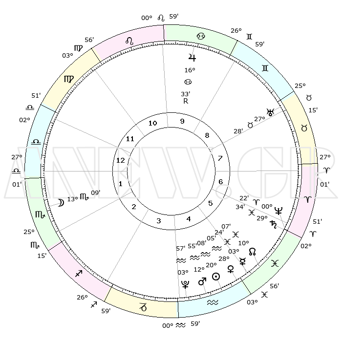 | | ΘΕΣΕΙΣ ΠΛΑΝΗΤΩΝ ΑΣΤΡΟΛΟΓΙΚΟΥ ΧΑΡΤΗ ΤΗΣ ΣΤΙΓΜΗΣ ΑΥΤΗΣ | | | | Πλανήτης | Ζώδιο | Μοίρες | Δεκαήμ. | Σε οίκο | Απόκλιση | | Ακμές των οίκων | | Ηλιος | Υδροχόος | 20°04' | Τρίτο | 5 | 14 S 47 | | 1ος | 07°53' | Ζυγός | | Σελήνη | Σκορπιός | 12°22' | Δεύτερο | 2 | 20 S 00 | | 2ος | 04°60' | Σκορπιός | | Ερμής | Ιχθείς | 03°17' | Πρώτο | 5 | 11 S 19 | | 3ος | 05°44' | Τοξότης | | Αφροδίτη | Υδροχόος | 28°00' | Τρίτο | 5 | 13 S 31 | | 4ος | 08°51' | Αιγόκερως | | Αρης | Υδροχόος | 12°52' | Δεύτερο | 5 | 17 S 58 | | 5ος | 11°47' | Υδροχόος | | Δίας | Καρκίνος | 16°33'R | Δεύτερο | 10 | 22 N 43 | | 6ος | 11°54' | Ιχθείς | | Κρόνος | Ιχθείς | 29°33' | Τρίτο | 6 | 02 S 09 | | 7ος | 07°53' | Κριός | | Ουρανός | Ταύρος | 27°28' | Τρίτο | 8 | 19 N 24 | | 8ος | 04°60' | Ταύρος | | Ποσειδώνας | Κριός | 00°22' | Πρώτο | 6 | 01 S 03 | | 9ος | 05°44' | Δίδυμοι | | Πλούτωνας | Υδροχόος | 03°57' | Πρώτο | 4 | 22 S 59 | | 10ος | 08°51' | Καρκίνος | | Β. Δεσμός | Ιχθείς | 10°07' | Δεύτερο | 5 | 07 S 46 | | 11ος | 11°47' | Λέων | | Ωροσκόπος | Ζυγός | 07°53' | Πρώτο | | | 12ος | 11°54' | Παρθένος | | Μεσουράνημα | Καρκίνος | 08°51' | Πρώτο | | | |
