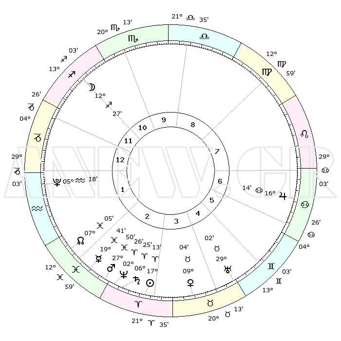 | | ΘΕΣΕΙΣ ΠΛΑΝΗΤΩΝ ΑΣΤΡΟΛΟΓΙΚΟΥ ΧΑΡΤΗ ΤΗΣ ΣΤΙΓΜΗΣ ΑΥΤΗΣ | | | | Πλανήτης | Ζώδιο | Μοίρες | Δεκαήμ. | Σε οίκο | Απόκλιση | | Ακμές των οίκων | | Ηλιος | Κριός | 17°09' | Δεύτερο | 3 | 06 N 44 | | 1ος | 02°59' | Αιγόκερως | | Σελήνη | Τοξότης | 11°38' | Δεύτερο | 11 | 27 S 17 | | 2ος | 10°53' | Υδροχόος | | Ερμής | Ιχθείς | 19°36' | Δεύτερο | 2 | 06 S 01 | | 3ος | 21°04' | Ιχθείς | | Αφροδίτη | Ταύρος | 08°58' | Πρώτο | 4 | 14 N 18 | | 4ος | 24°31' | Κριός | | Αρης | Ιχθείς | 27°47' | Τρίτο | 3 | 01 S 49 | | 5ος | 20°22' | Ταύρος | | Δίας | Καρκίνος | 16°13' | Δεύτερο | 7 | 22 N 49 | | 6ος | 11°59' | Δίδυμοι | | Κρόνος | Κριός | 06°24' | Πρώτο | 3 | 00 N 35 | | 7ος | 02°59' | Καρκίνος | | Ουρανός | Ταύρος | 29°02' | Τρίτο | 5 | 19 N 46 | | 8ος | 10°53' | Λέων | | Ποσειδώνας | Κριός | 02°26' | Πρώτο | 3 | 00 S 14 | | 9ος | 21°04' | Παρθένος | | Πλούτωνας | Υδροχόος | 05°18' | Πρώτο | 1 | 22 S 47 | | 10ος | 24°31' | Ζυγός | | Β. Δεσμός | Ιχθείς | 07°05' | Πρώτο | 2 | 08 S 54 | | 11ος | 20°22' | Σκορπιός | | Ωροσκόπος | Αιγόκερως | 02°59' | Πρώτο | | | 12ος | 11°59' | Τοξότης | | Μεσουράνημα | Ζυγός | 24°31' | Τρίτο | | | |