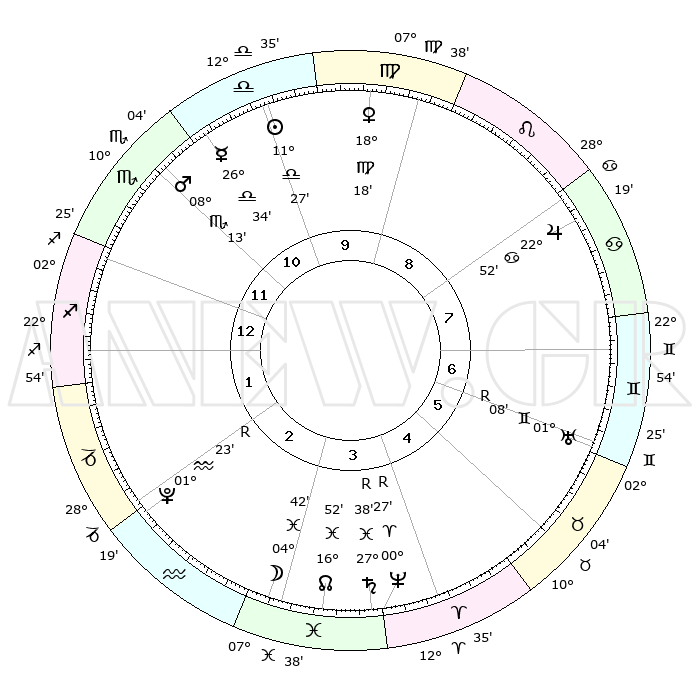 | ΘΕΣΕΙΣ ΠΛΑΝΗΤΩΝ ΑΣΤΡΟΛΟΓΙΚΟΥ ΧΑΡΤΗ ΤΗΣ ΣΤΙΓΜΗΣ ΑΥΤΗΣ | | Πλανήτης | Ζώδιο | Μοίρες | Δεκαήμ. | Σε οίκο | Απόκλιση | | Ακμές των οίκων | Ηλιος | Ζυγός | 11°20' | Δεύτερο | 11 | 04 S 29 | | 1ος | 18°07' | Σκορπιός | Σελήνη | Ιχθείς | 03°05' | Πρώτο | 4 | 11 S 39 | | 2ος | 17°53' | Τοξότης | Ερμής | Ζυγός | 26°23' | Τρίτο | 12 | 10 S 39 | | 3ος | 21°46' | Αιγόκερως | Αφροδίτη | Παρθένος | 18°10' | Δεύτερο | 10 | 05 N 56 | | 4ος | 27°15' | Υδροχόος | Αρης | Σκορπιός | 08°08' | Πρώτο | 12 | 14 S 19 | | 5ος | 29°28' | Ιχθείς | Δίας | Καρκίνος | 22°51' | Τρίτο | 9 | 21 N 31 | | 6ος | 26°07' | Κριός | Κρόνος | Ιχθείς | 27°38'R | Τρίτο | 4 | 03 S 15 | | 7ος | 18°07' | Ταύρος | Ουρανός | Δίδυμοι | 01°08'R | Πρώτο | 7 | 20 N 11 | | 8ος | 17°53' | Δίδυμοι | Ποσειδώνας | Κριός | 00°27'R | Πρώτο | 5 | 01 S 05 | | 9ος | 21°46' | Καρκίνος | Πλούτωνας | Υδροχόος | 01°23'R | Πρώτο | 3 | 23 S 32 | | 10ος | 27°15' | Λέων | Β. Δεσμός | Ιχθείς | 16°52' | Δεύτερο | 4 | 05 S 11 | | 11ος | 29°28' | Παρθένος | Ωροσκόπος | Σκορπιός | 18°07' | Δεύτερο | | | 12ος | 26°07' | Ζυγός | Μεσουράνημα | Λέων | 27°15' | Τρίτο | | | |