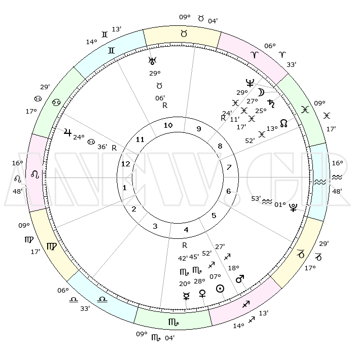 | | ΘΕΣΕΙΣ ΠΛΑΝΗΤΩΝ ΑΣΤΡΟΛΟΓΙΚΟΥ ΧΑΡΤΗ ΤΗΣ ΣΤΙΓΜΗΣ ΑΥΤΗΣ | | | | Πλανήτης | Ζώδιο | Μοίρες | Δεκαήμ. | Σε οίκο | Απόκλιση | | Ακμές των οίκων | | Ηλιος | Τοξότης | 07°50' | Πρώτο | 5 | 21 S 37 | | 1ος | 07°21' | Λέων | | Σελήνη | Ιχθείς | 26°44' | Τρίτο | 9 | 00 S 18 | | 2ος | 28°57' | Λέων | | Ερμής | Σκορπιός | 20°42'R | Τρίτο | 4 | 15 S 28 | | 3ος | 24°60' | Παρθένος | | Αφροδίτη | Σκορπιός | 28°43' | Τρίτο | 4 | 19 S 08 | | 4ος | 26°50' | Ζυγός | | Αρης | Τοξότης | 18°25' | Δεύτερο | 5 | 23 S 35 | | 5ος | 02°35' | Τοξότης | | Δίας | Καρκίνος | 24°36'R | Τρίτο | 12 | 21 N 21 | | 6ος | 07°08' | Αιγόκερως | | Κρόνος | Ιχθείς | 25°17' | Τρίτο | 9 | 04 S 03 | | 7ος | 07°21' | Υδροχόος | | Ουρανός | Ταύρος | 29°06'R | Τρίτο | 10 | 19 N 45 | | 8ος | 28°57' | Υδροχόος | | Ποσειδώνας | Ιχθείς | 29°24'R | Τρίτο | 9 | 01 S 29 | | 9ος | 24°60' | Ιχθείς | | Πλούτωνας | Υδροχόος | 01°53' | Πρώτο | 6 | 23 S 24 | | 10ος | 26°50' | Κριός | | Β. Δεσμός | Ιχθείς | 13°52' | Δεύτερο | 8 | 06 S 21 | | 11ος | 02°35' | Δίδυμοι | | Ωροσκόπος | Λέων | 07°21' | Πρώτο | | | 12ος | 07°08' | Καρκίνος | | Μεσουράνημα | Κριός | 26°50' | Τρίτο | | | |