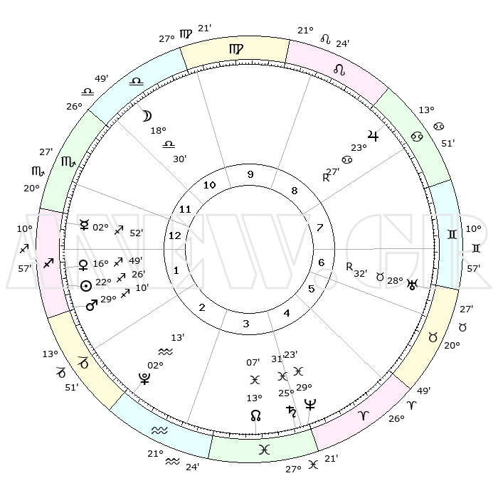 | | ΘΕΣΕΙΣ ΠΛΑΝΗΤΩΝ ΑΣΤΡΟΛΟΓΙΚΟΥ ΧΑΡΤΗ ΤΗΣ ΣΤΙΓΜΗΣ ΑΥΤΗΣ | | | | Πλανήτης | Ζώδιο | Μοίρες | Δεκαήμ. | Σε οίκο | Απόκλιση | | Ακμές των οίκων | | Ηλιος | Τοξότης | 22°16' | Τρίτο | 3 | 23 S 12 | | 1ος | 21°43' | Ζυγός | | Σελήνη | Ζυγός | 16°29' | Δεύτερο | 12 | 09 S 02 | | 2ος | 19°40' | Σκορπιός | | Ερμής | Τοξότης | 02°39' | Πρώτο | 2 | 19 S 03 | | 3ος | 21°03' | Τοξότης | | Αφροδίτη | Τοξότης | 16°36' | Δεύτερο | 2 | 22 S 33 | | 4ος | 24°44' | Αιγόκερως | | Αρης | Τοξότης | 29°02' | Τρίτο | 3 | 24 S 12 | | 5ος | 27°41' | Υδροχόος | | Δίας | Καρκίνος | 23°28'R | Τρίτο | 9 | 21 N 35 | | 6ος | 27°01' | Ιχθείς | | Κρόνος | Ιχθείς | 25°30' | Τρίτο | 5 | 03 S 55 | | 7ος | 21°43' | Κριός | | Ουρανός | Ταύρος | 28°32'R | Τρίτο | 8 | 19 N 38 | | 8ος | 19°40' | Ταύρος | | Ποσειδώνας | Ιχθείς | 29°23' | Τρίτο | 6 | 01 S 29 | | 9ος | 21°03' | Δίδυμοι | | Πλούτωνας | Υδροχόος | 02°13' | Πρώτο | 4 | 23 S 20 | | 10ος | 24°44' | Καρκίνος | | Β. Δεσμός | Ιχθείς | 13°07' | Δεύτερο | 5 | 06 S 38 | | 11ος | 27°41' | Λέων | | Ωροσκόπος | Ζυγός | 21°43' | Τρίτο | | | 12ος | 27°01' | Παρθένος | | Μεσουράνημα | Καρκίνος | 24°44' | Τρίτο | | | |